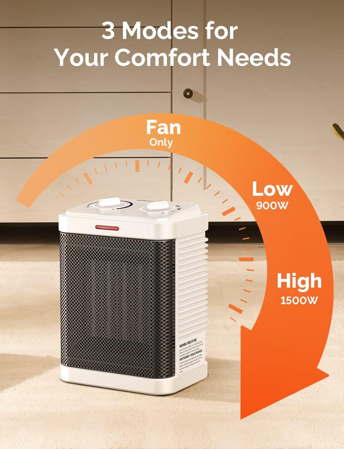 MULTI-HEATING MODES: 3 desired comfort settings, High Heat (1500 watts), Low Heat (900 watts), and Natural Wind, make this electric space heater perfect for warming up your home or home office area. Adjustable temperature settings help to quickly increase the temperature based on the thermostat control.