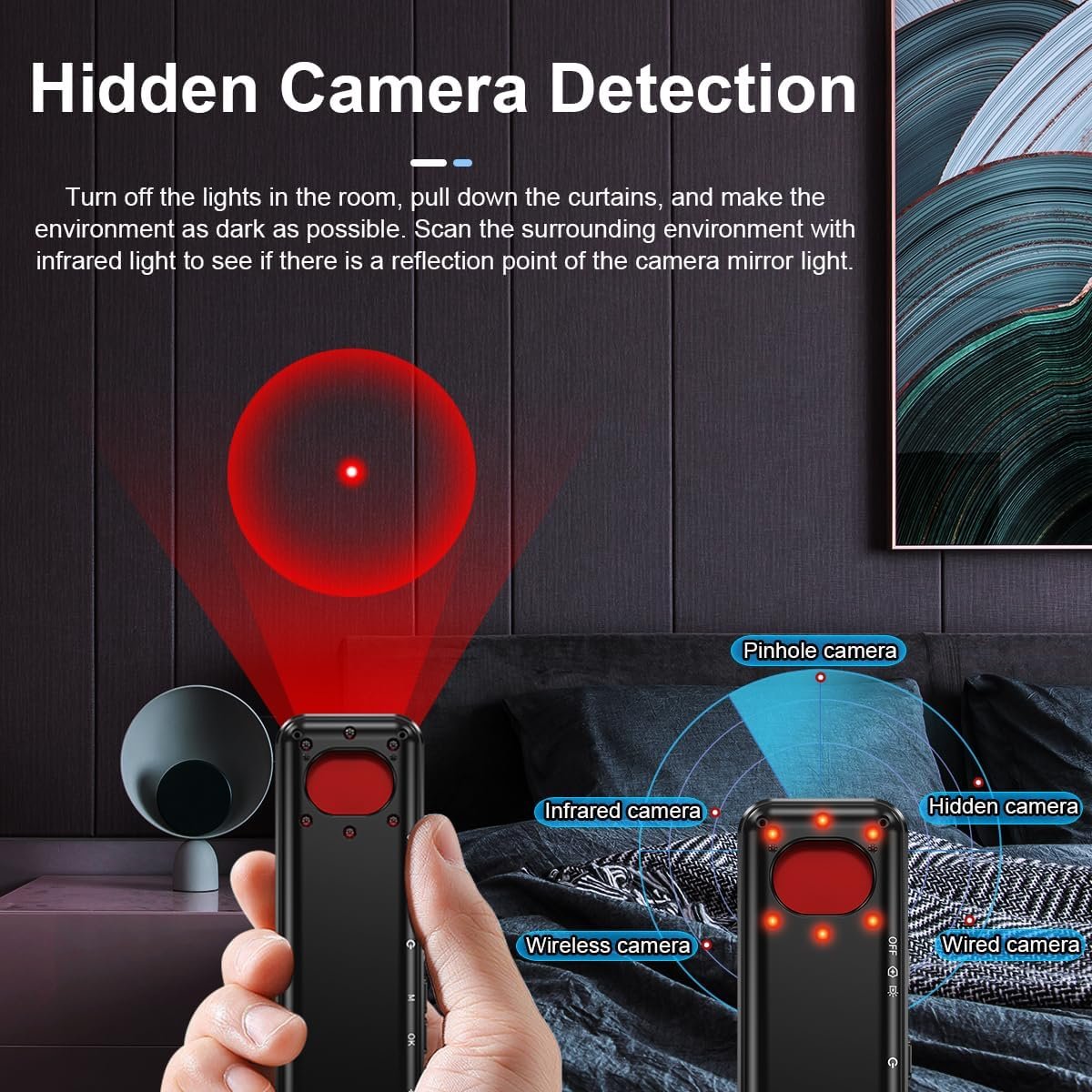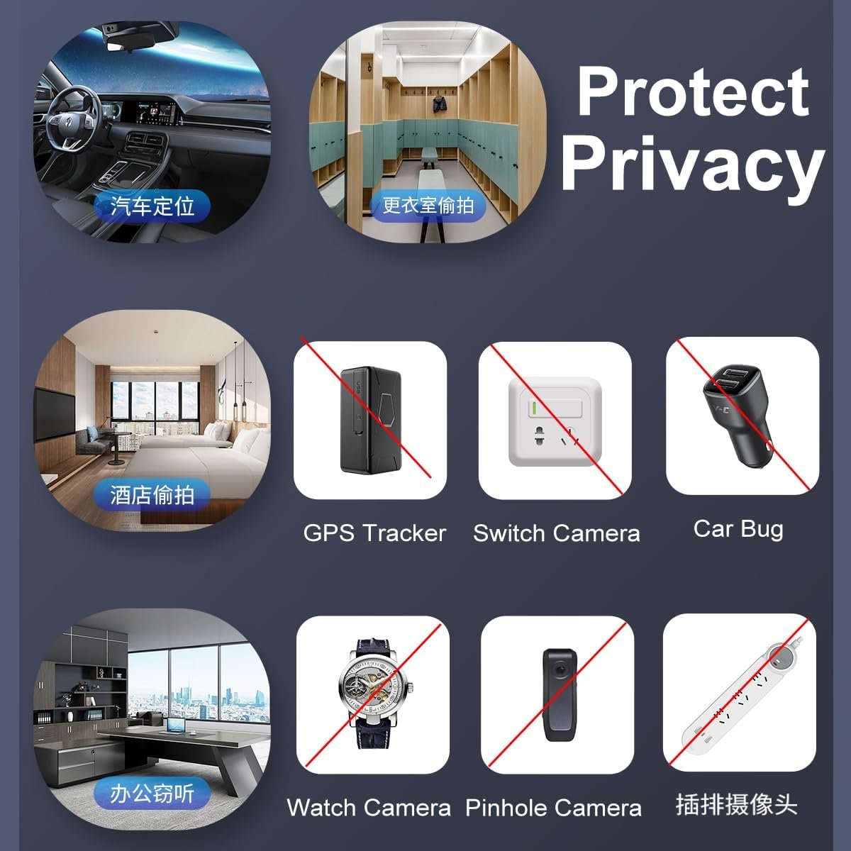 Portable Camera Detector: Small size, light weight, easy to carry for travel. Your personal privacy and business information must be protected. Handy camera scanner finder worth keeping on hand when you need to stay at a hotel, Airbnb, vacation rental. It is also recommended to scan bathrooms, fitting rooms, bedrooms, washrooms, meeting rooms for any privacy breaches. It can scan your vehicle for any unwanted GPS trackers that stalkers are hiding.