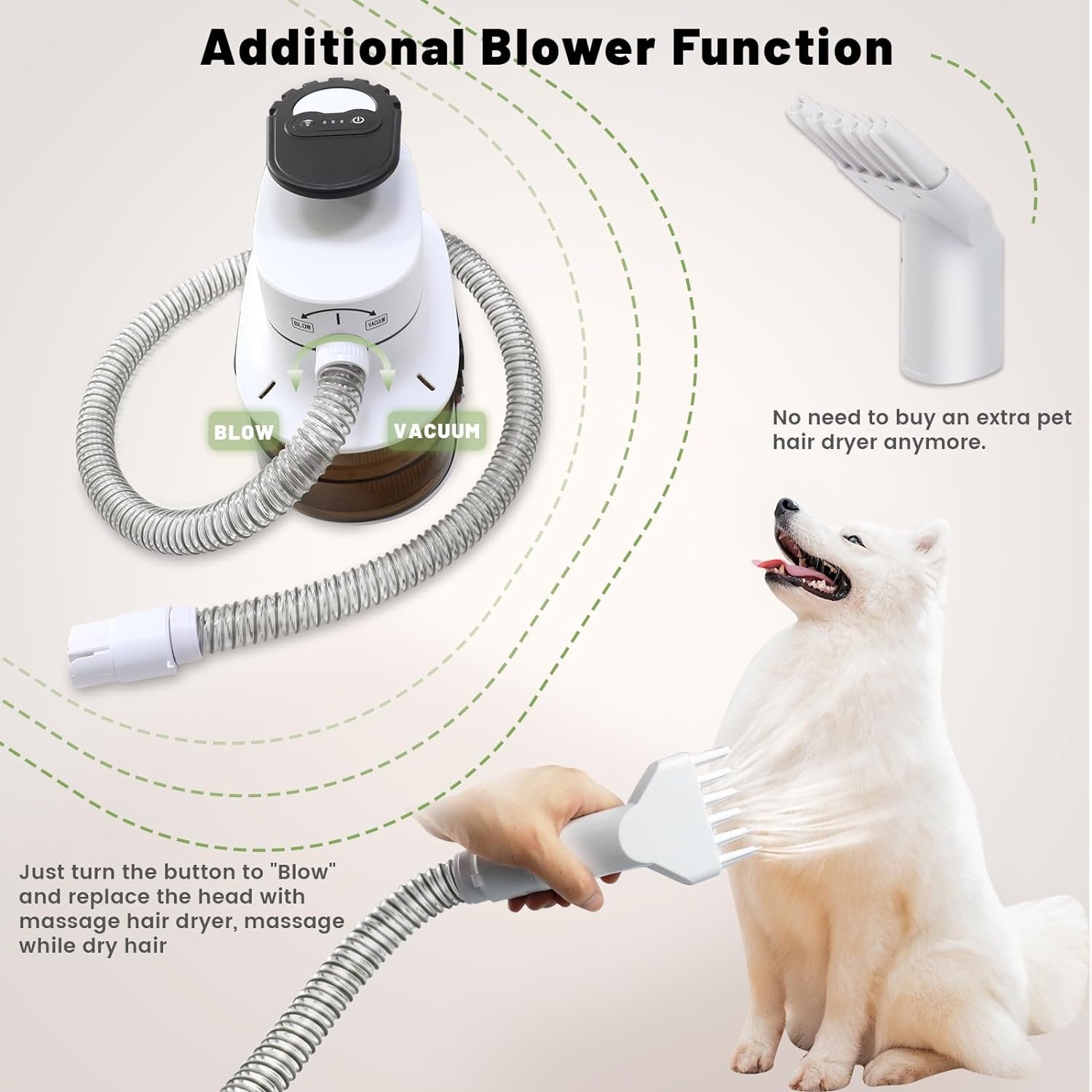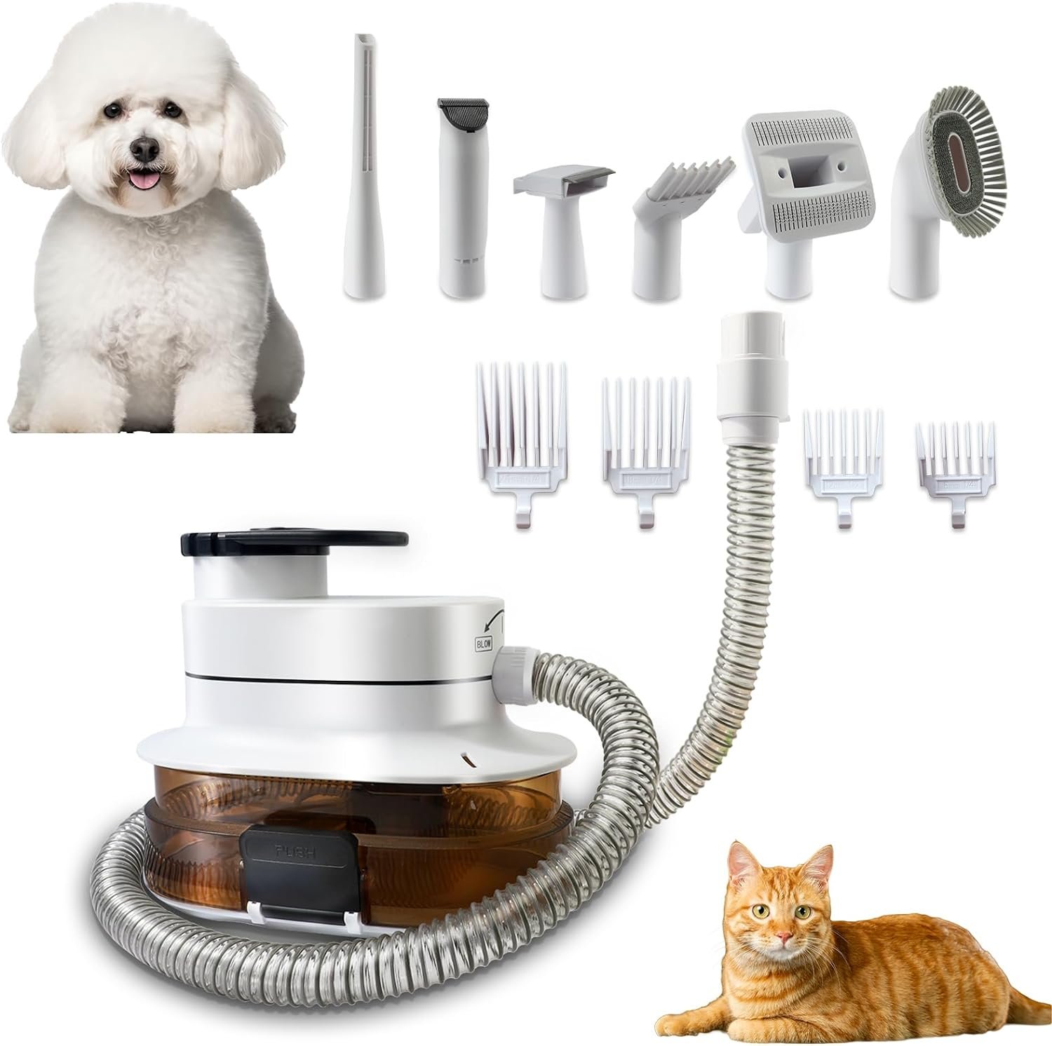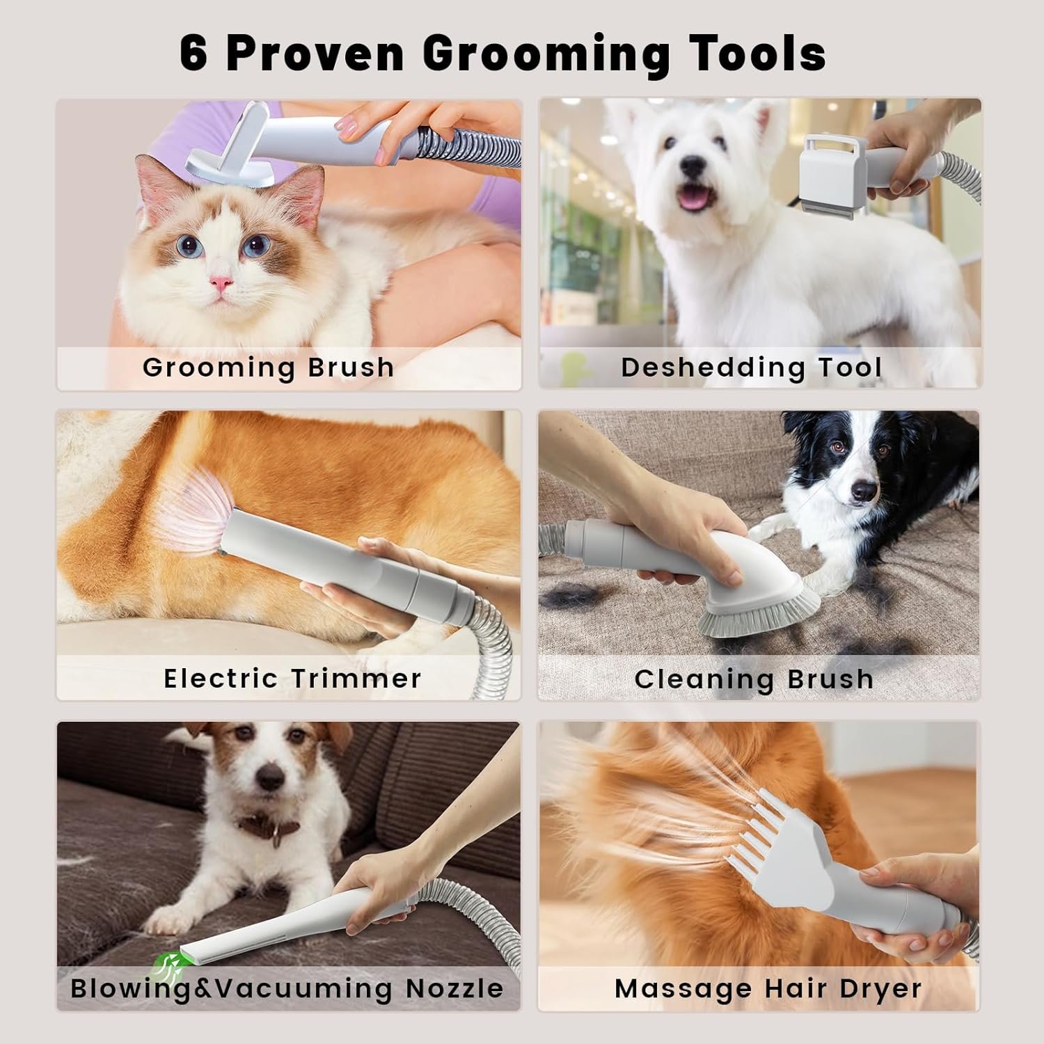 🐩Free Pet Salon at Home:6 grooming heads with different functions to satisfy pets including grooming, shaving, massage, hair drying and hair cleaning.