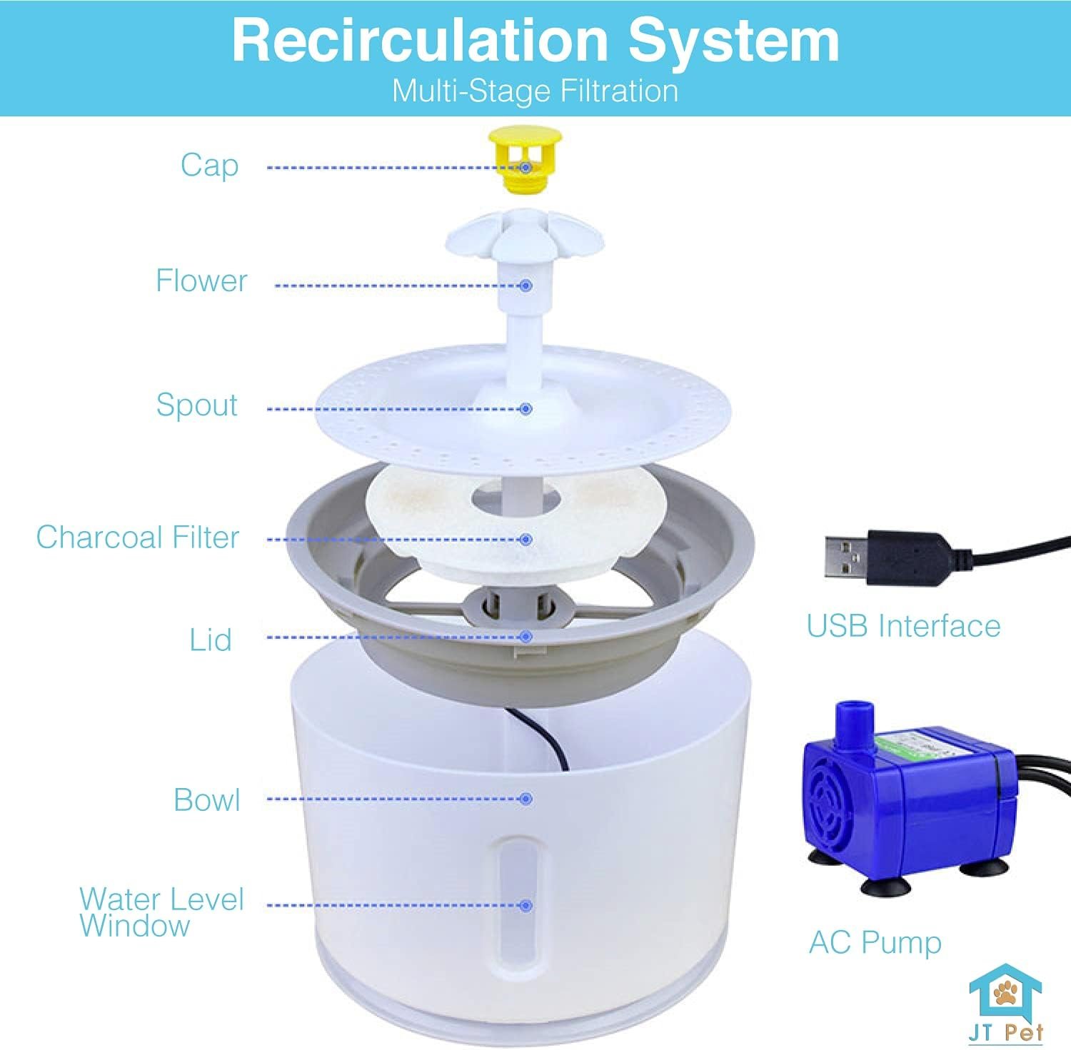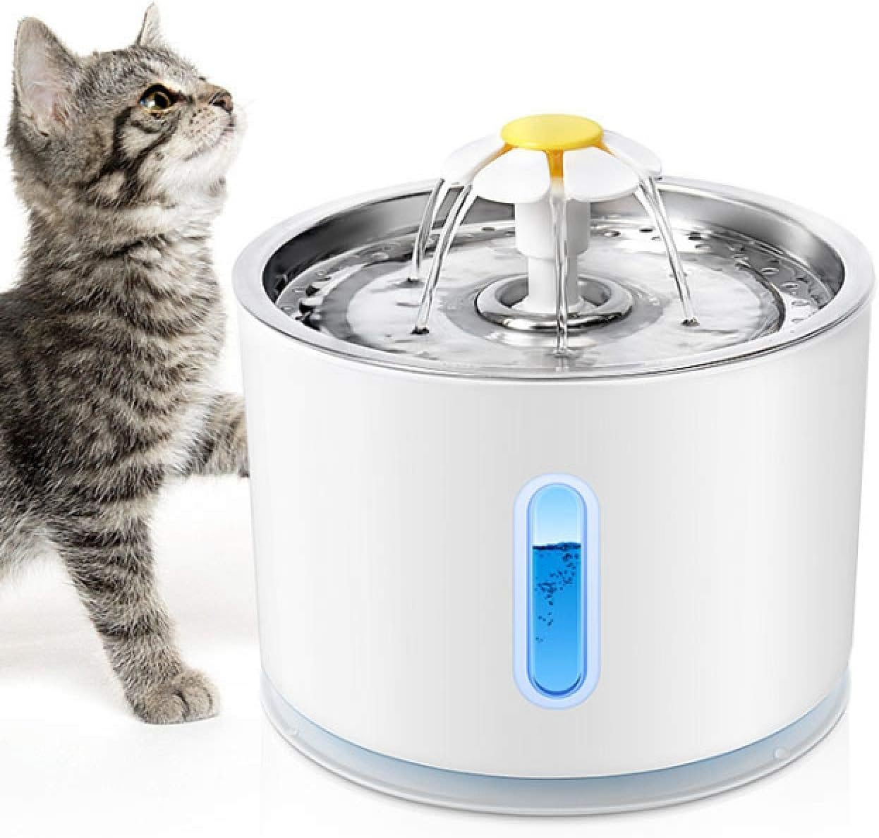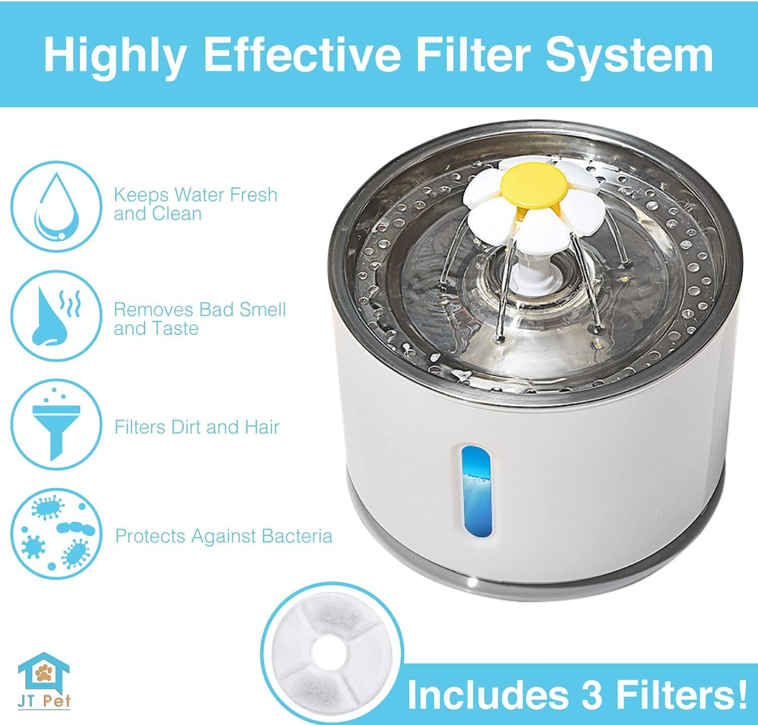 Holds 2.4 liters of water in a BPA-free bowl and comes with 3 charcoal water fountain filters that are natural and effective at removing many toxins from the water while improving the taste