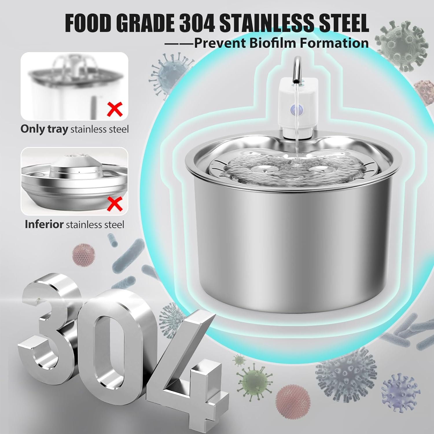 Stainless Steel & External Pump: The cat water fountain adapts durable 304 stainless steel that’s easy to clean, won’t crack and not absorb odors, with water and electricity separated external pump for safety. The pump is not in the water and IPX65 waterproof, making its electricity safe and preventing hairs coming in. The separation design also makes it easy to clean and maintain.