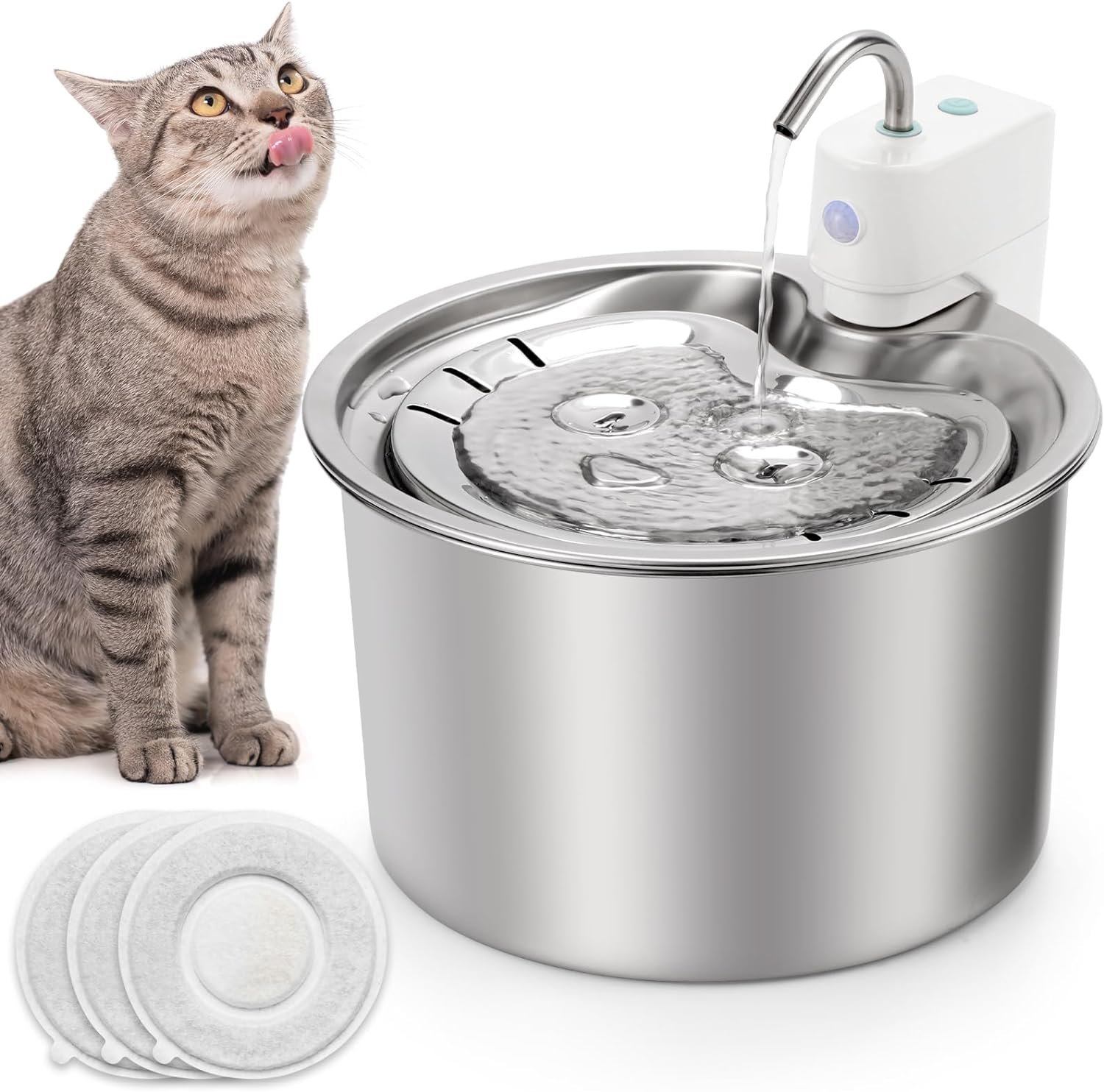 Multi-layer Circulating Filtration System: Equipped with 3PCS replacement filters. Each one has 3-layer advanced filtration system, including ion exchange resin, coconut activated carbon, and cotton. Filter the hairs, soften water quality, improve taste to provide cleaner and healthier water for your cat . We recommend changing the filter every 1-2 weeks (we sell the filters separatively in our store) for optimal performance.