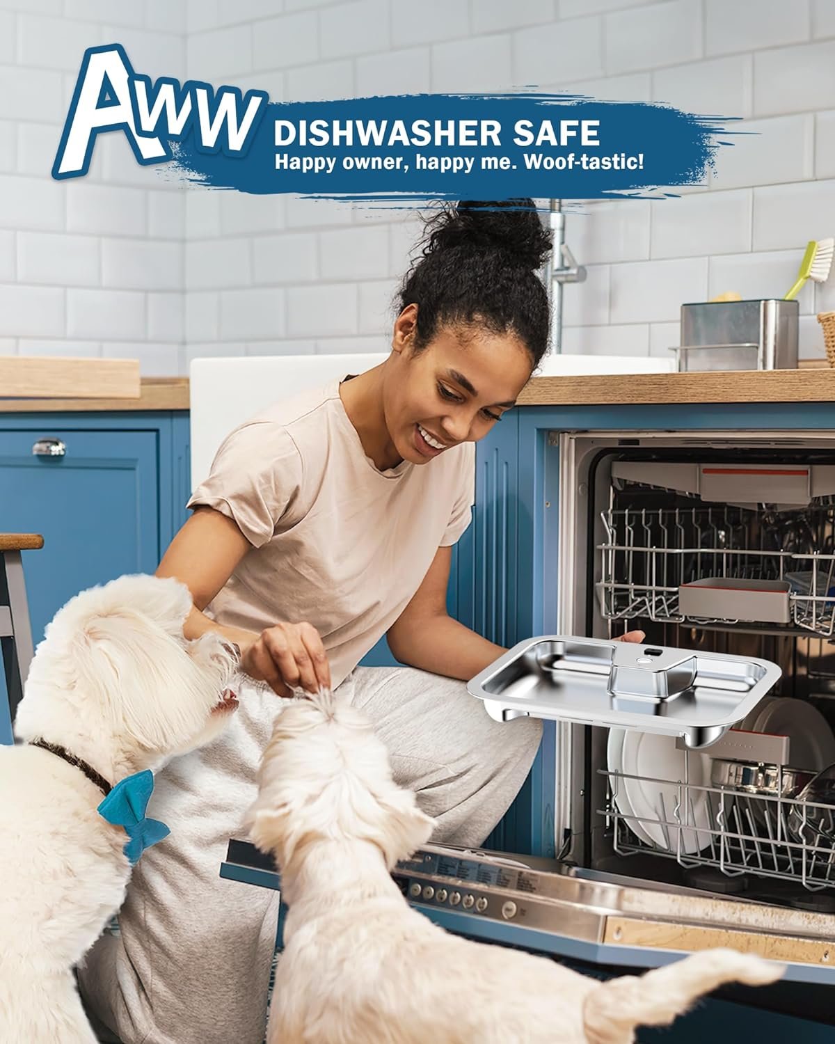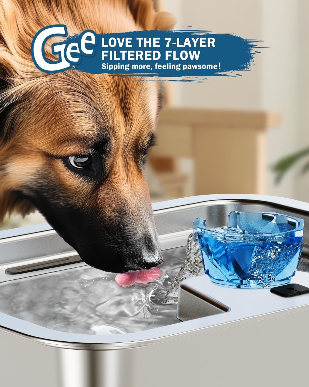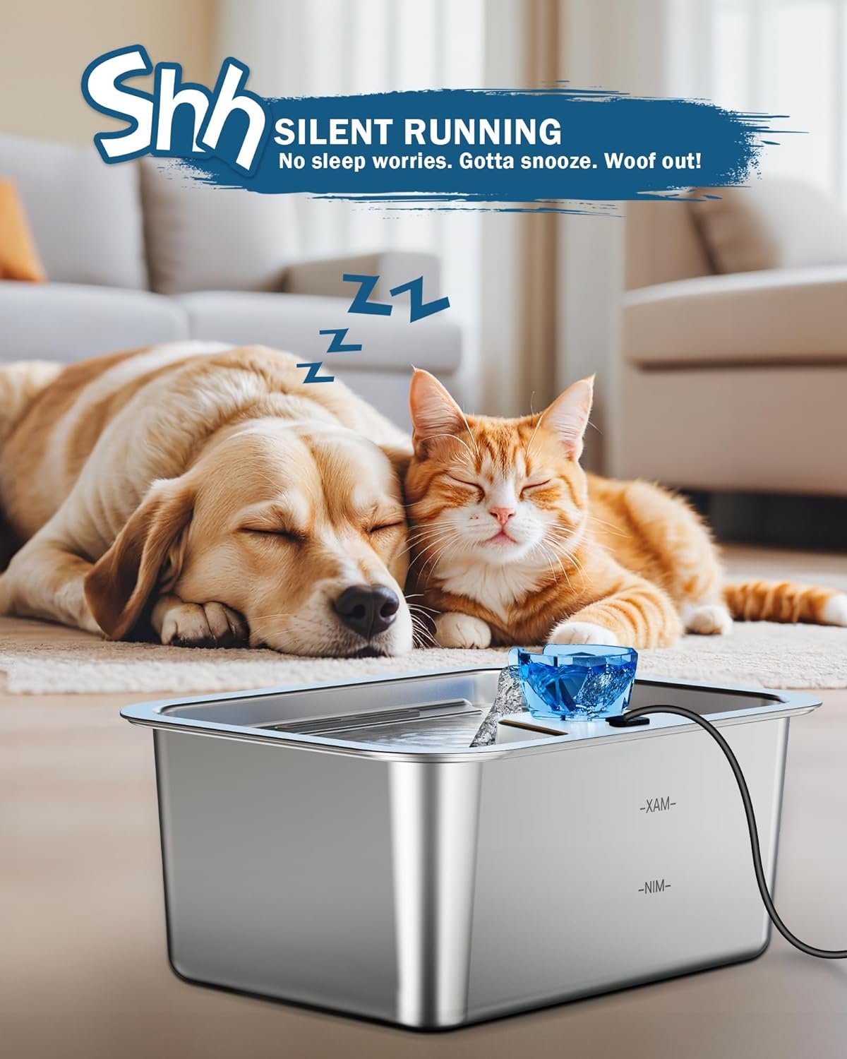 STAINLESS STEEL DOG FOUNTAINS: Our large dog water fountain for large dogs is made from food-grade SUS304 stainless steel, ensuring long-lasting durability without BPA. Unlike plastic, the dog water fountain stainless steel effectively prevents chin acne, is easier to keep clean, and ensures pets receive cooler, fresher water, promoting pet health.