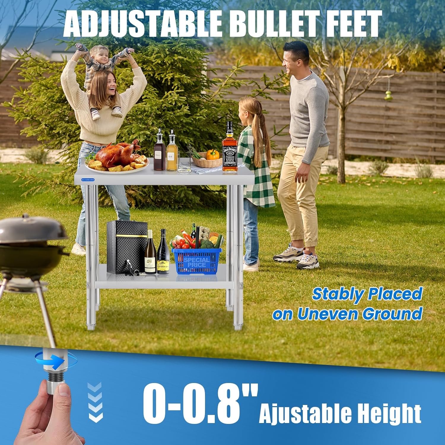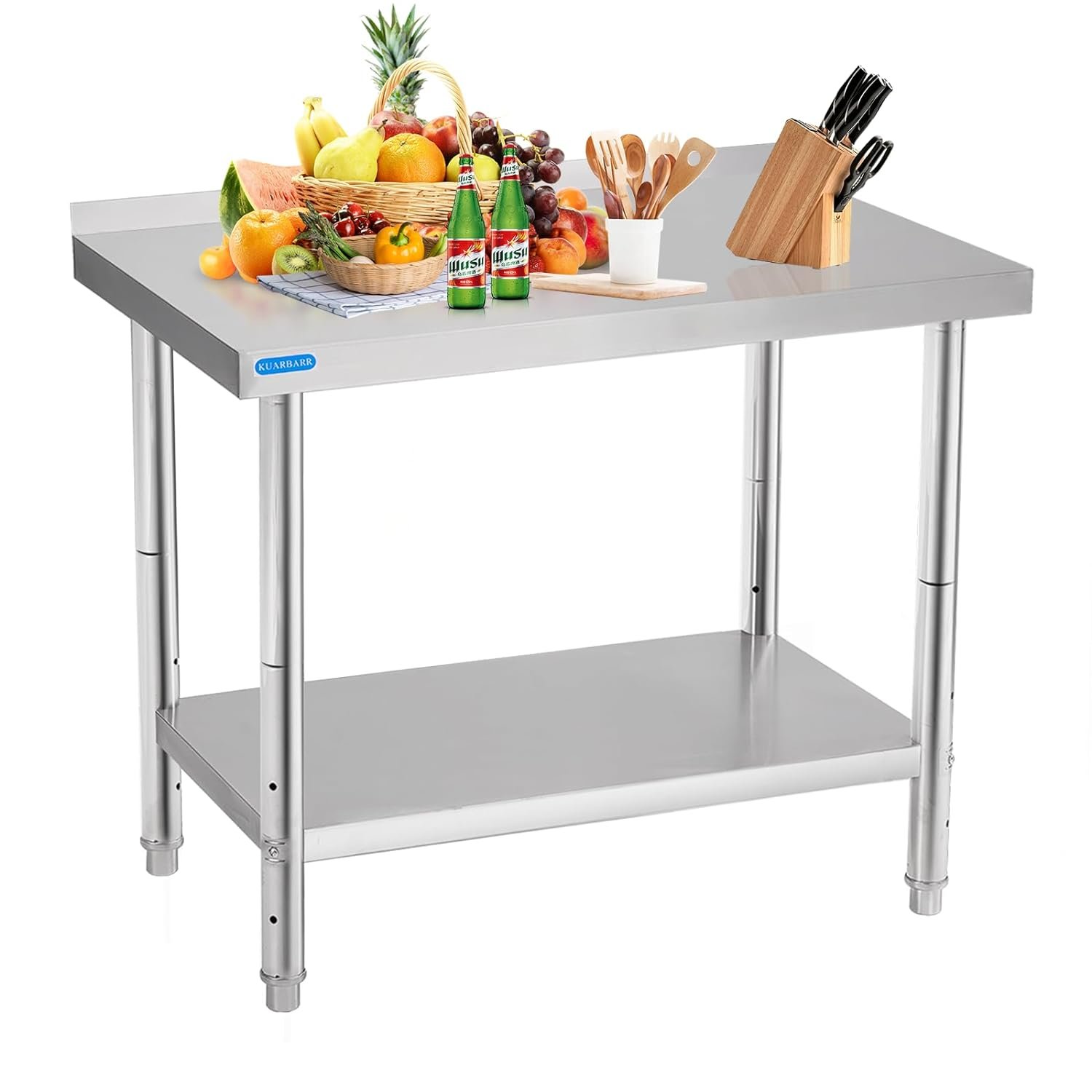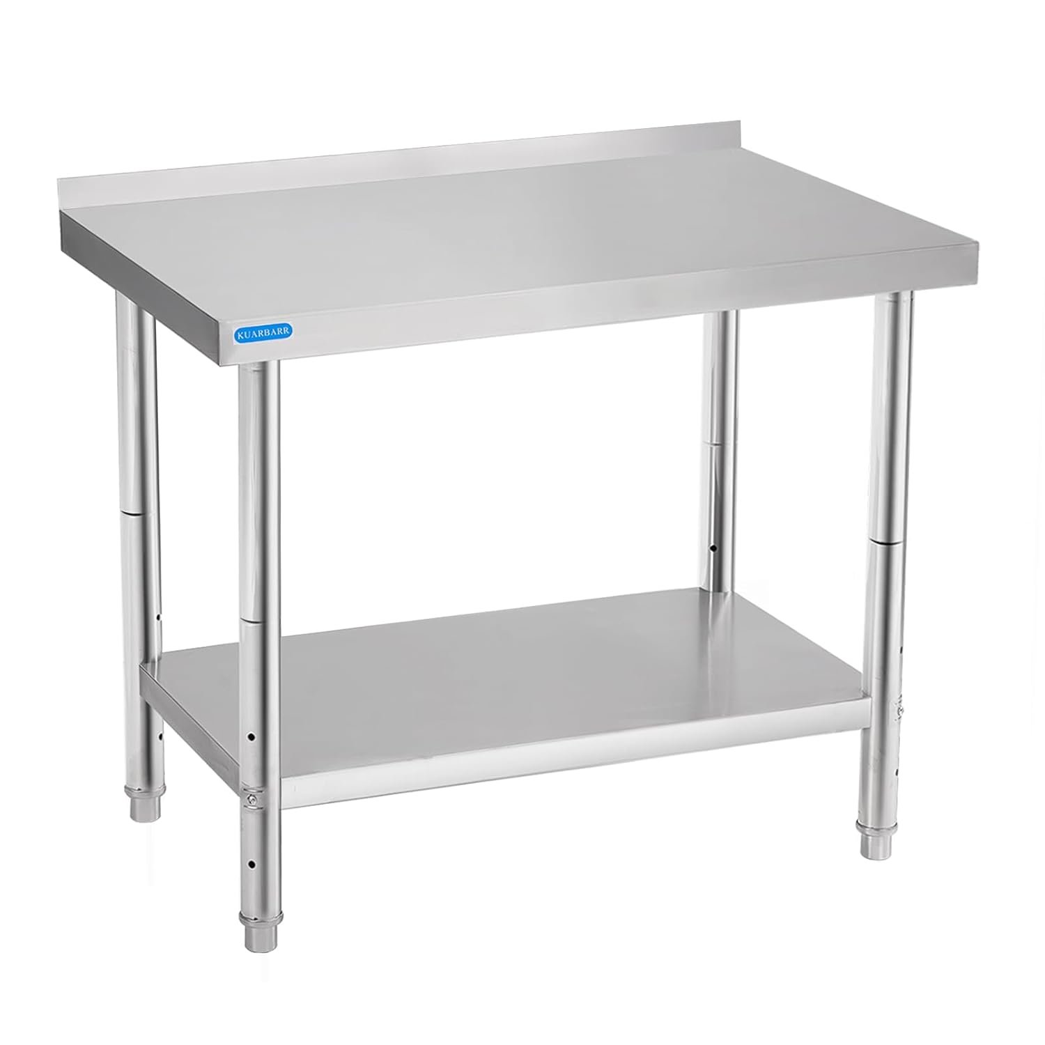 ADJUSTABLE UNDERSHELF: The KUARBARR stainless steel table features an undershelf with three adjustable heights. Each height is spaced at intervals of 3.15 inches, ensuring efficient utilization of space and providing flexibility to meet various requirements.