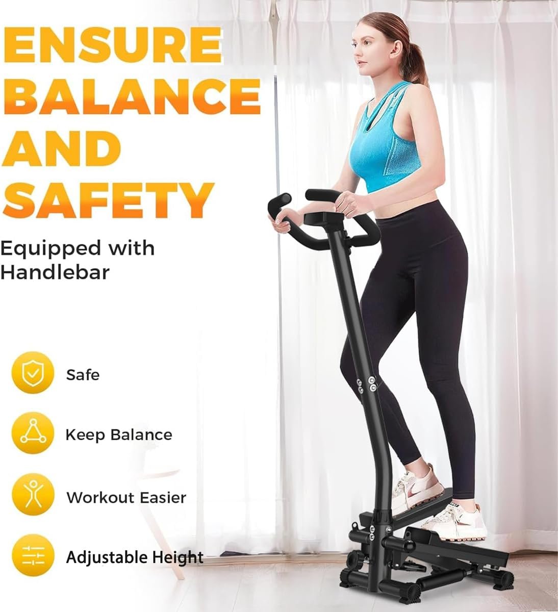 【Upgrade Mini Stepper With Handlebar】Stepper with Handlebar helps keep you balanced while you step. Great for beginners who are new to the stepping world. The U-shaped Handlebar Provides different grip points and meets more different heights of your family. The new design of the handlebar rod bent outwards provides enough space for stepping exercises to prevent the knee from touching the rod during exercise.