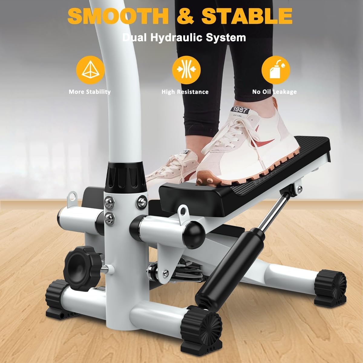 【Quiet Hydraulic Drive System】This mini stair stepper with a handlebar provides a quiet and safe environment. The internal super-energy spring protects the joints and provides a good cushioning effect. Shock Absorb Cushion installed under the pedals, could reduce the movement noise.