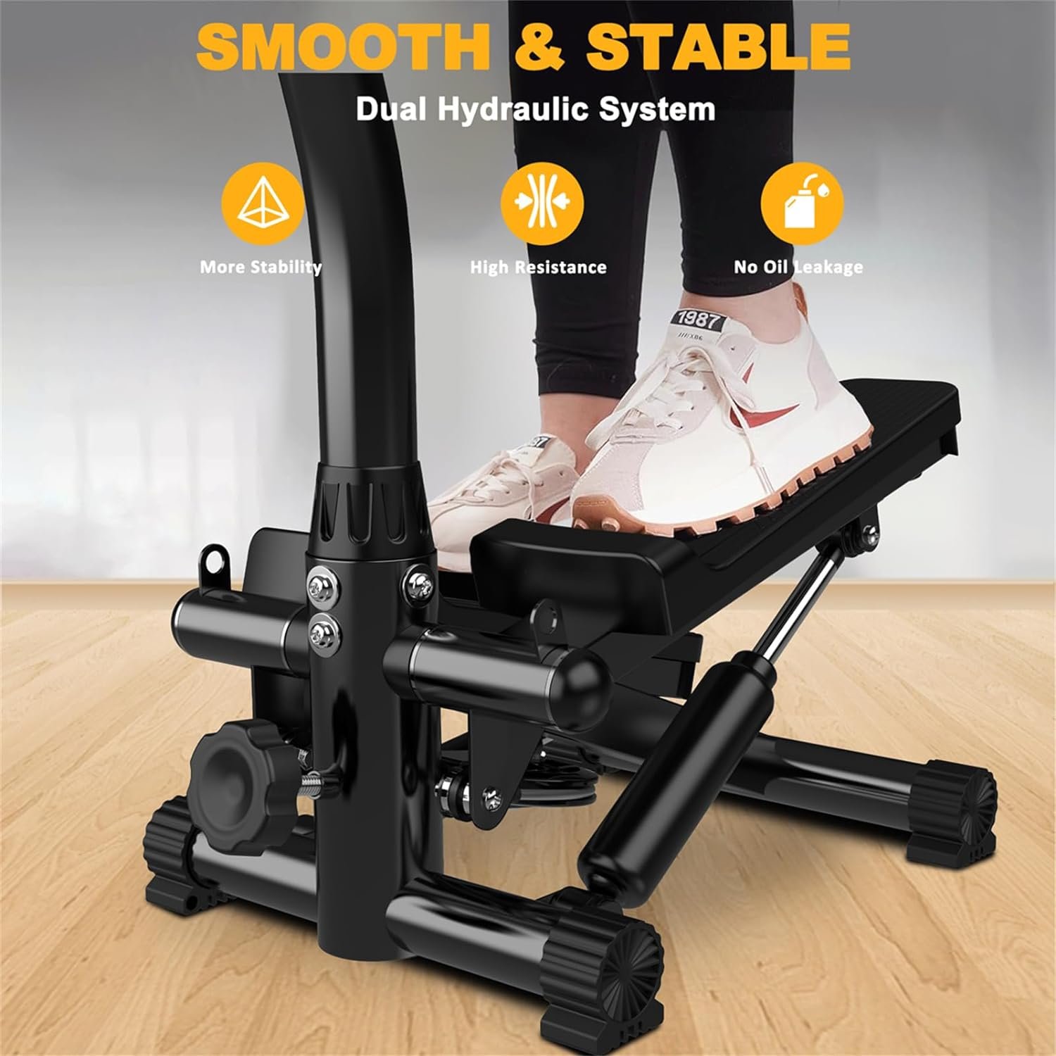 【Quiet Hydraulic Drive System】This mini stair stepper with a handlebar provides a quiet and safe environment. The internal super-energy spring protects the joints and provides a good cushioning effect. Shock Absorb Cushion installed under the pedals, could reduce the movement noise.