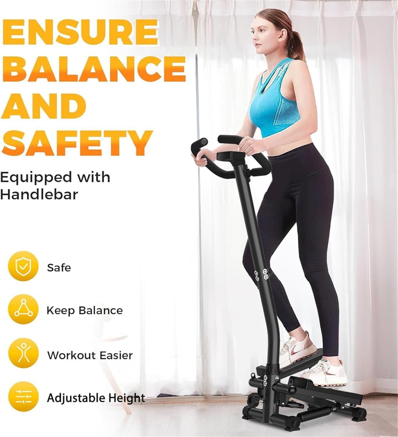 【Upgrade Mini Stepper With Handlebar】Stepper with Handlebar helps keep you balanced while you step. Great for beginners who are new to the stepping world. The U-shaped Handlebar Provides different grip points and meets more different heights of your family. The new design of the handlebar rod bent outwards provides enough space for stepping exercises to prevent the knee from touching the rod during exercise.