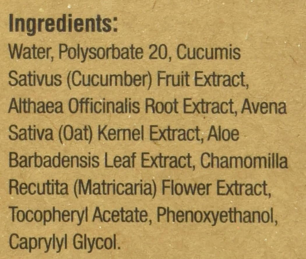Water, Polysorbate 20, Cucumis Sativus (Cucumber) Fruit Extract, Althaea Officinalis Root Extract, Avena Sativa (Oat) Kernel Extract, Aloe Barbadensis Leaf Extract, Chamomilla Recutita (Matricaria) Flower Extract, Tocopheryl Acetate, Phenoxyethanol, Caprylyl Glycol.