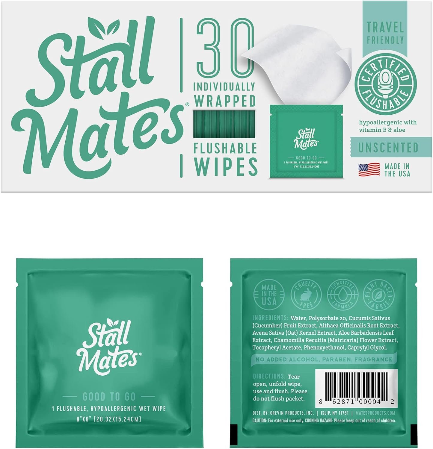 Stall Mates Wipes – Flushable Wipes | Individually Wrapped | Travel Friendly | Unscented with Vitamin-E & Aloe | (30 on-the-go singles)