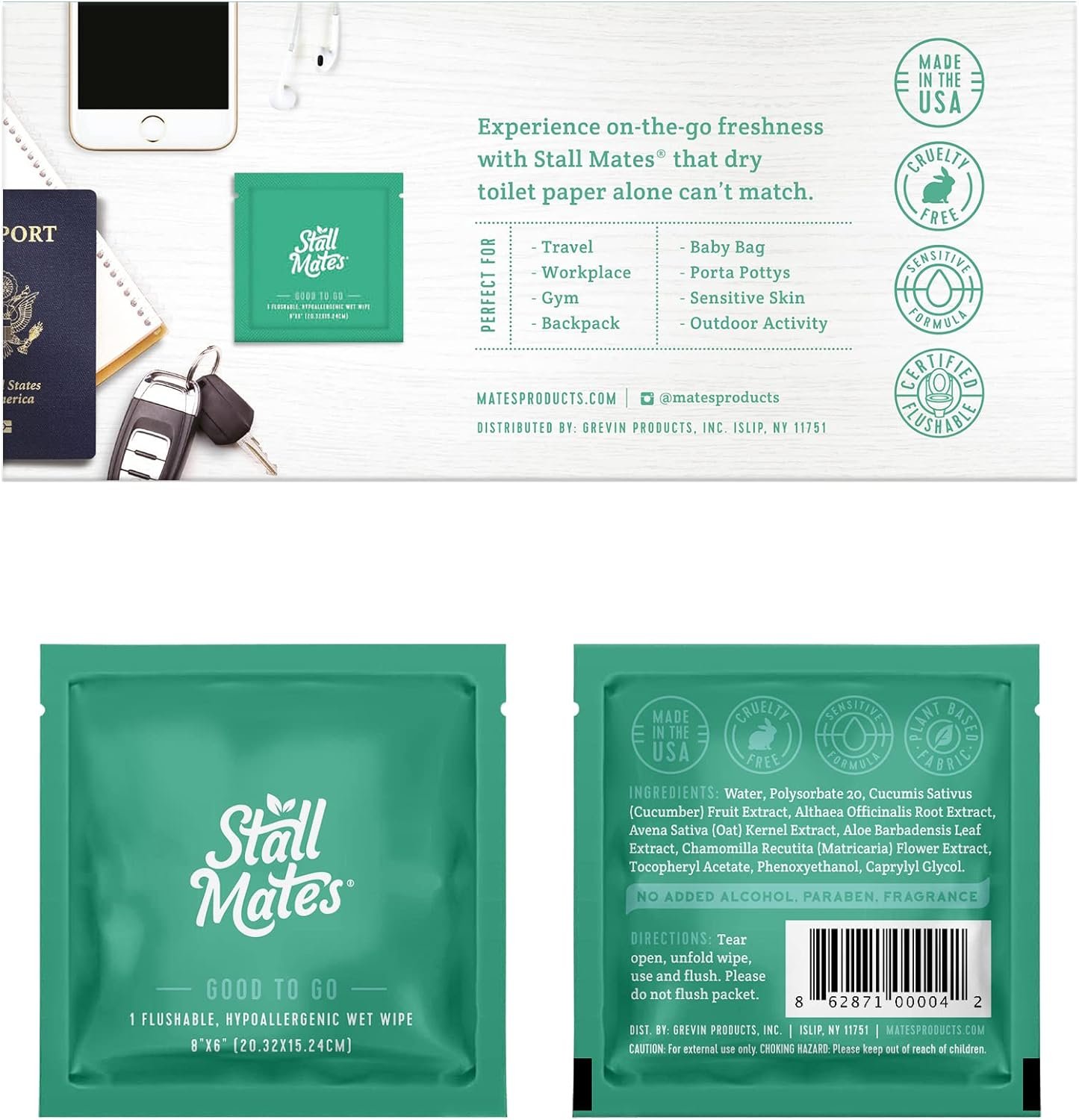 Experience on-the-go freshness with Stall Mates dry toilet paper alone can’t match. These flushable wipe singles are designed for travel and an on-the-go lifestyle. Stall Mates are individually wrapped moist towelettes that will keep you fresh and clean throughout your day. At the gym, office or a night out, Stall Mates will keep you prepared for any bathroom encounter. Made with aloe, cucumber and chamomile, Stall Mates are manufactured right here in the USA using global components. This hypoallergenic wipe is paraben, alcohol and fragrance free, produced in a facility that is 100% solar powered.
