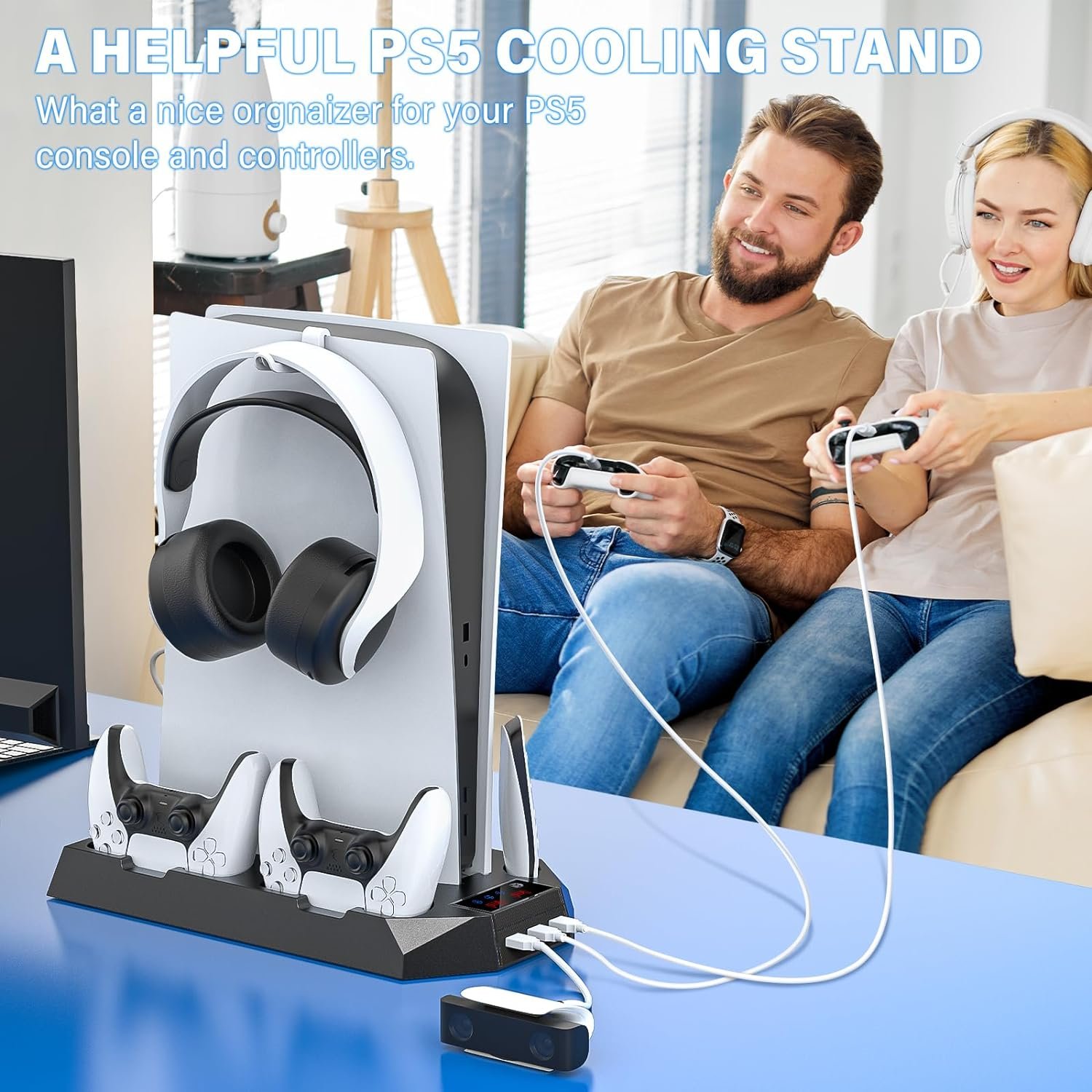 【Multifunctional All-in-One Cooling Stand for PS5】The stand with cooling fan and controller charger can cool down a console, charge two controllers, hold a headset and store a media remote, to save your space, keep PS5 accessories neat and tidy. The more functions make this stand as a perfect replacement for official PS5 controller charging station. Package include: charging station with cooling fan for PS5x 1, headset hook x 1, fixing screw x 1, user manual x 1.