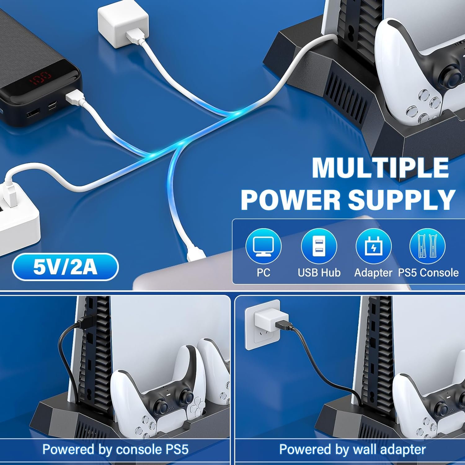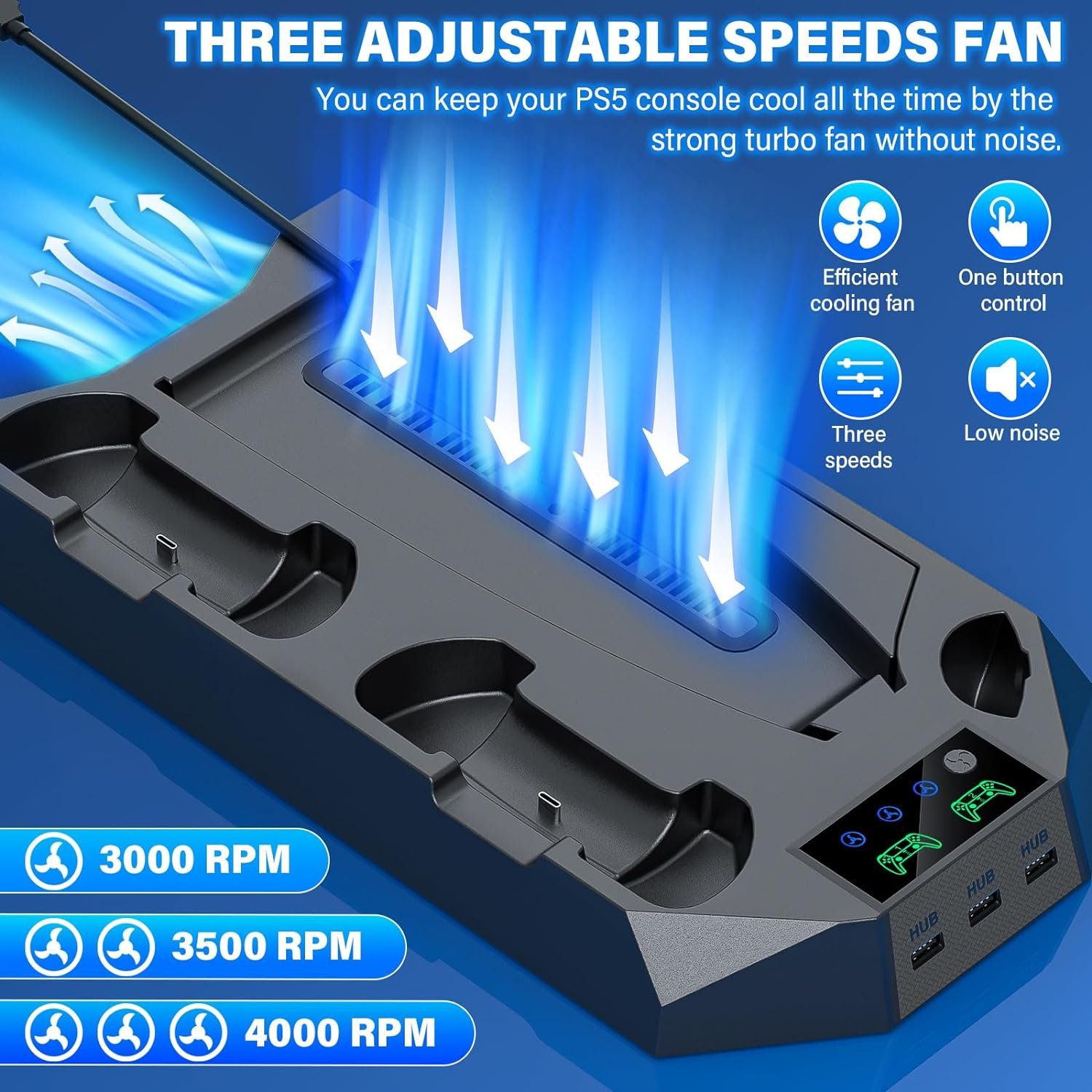 【Controller Charger with Three USB Hubs】The charging station for playstation 5 can charge two controllers, from zero to full charge within 3 hours. And the dock has charging indicators: red means charging, green means standby or fully charged. The stand with cooling fan can be powered by multiple devices as console, mobile bank, computer or other ≥5V/2A Standard AC adapters with the provided USB cable; and 3 USB ports to power other devices such as controllers, headphones, camera, etc.