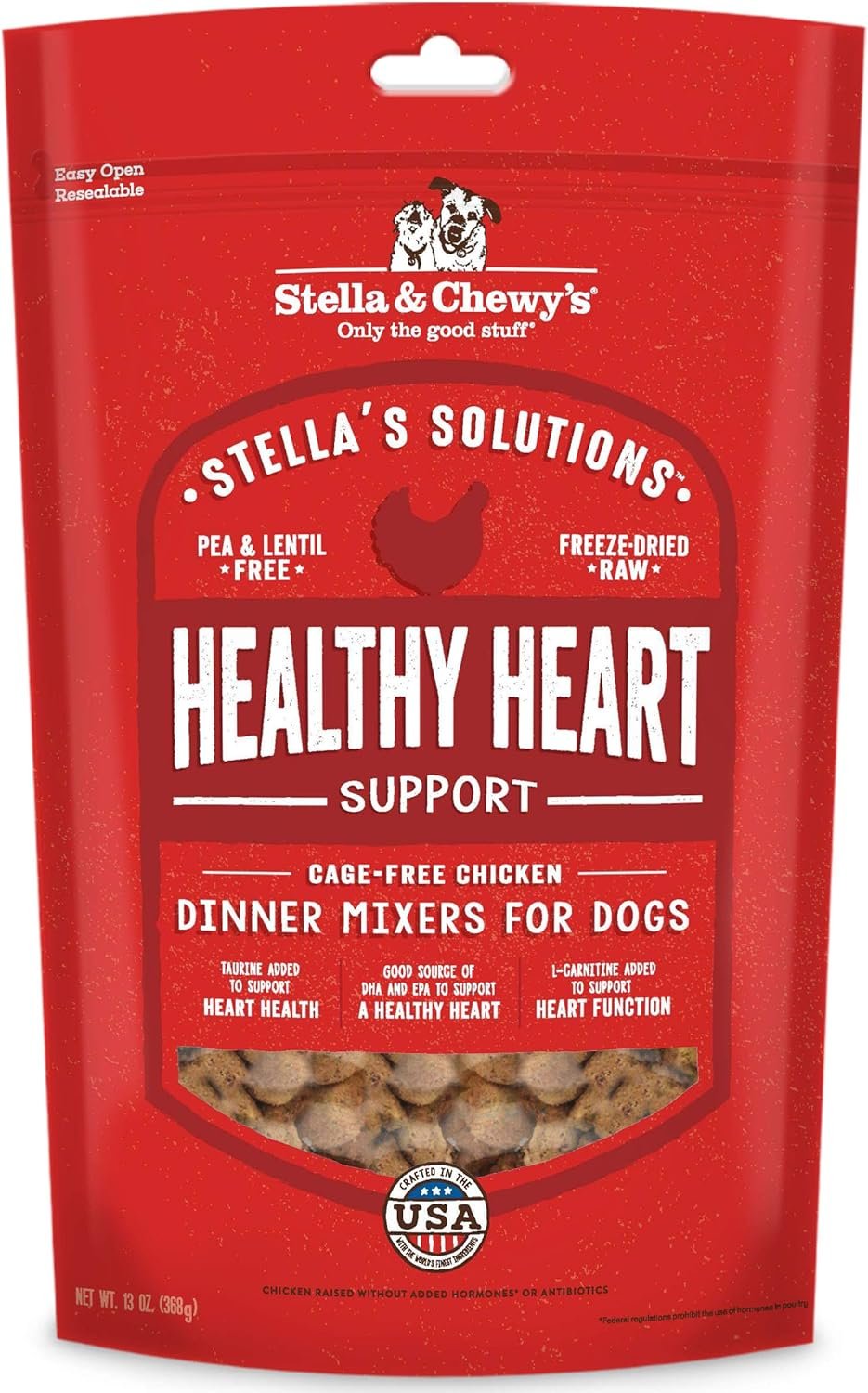 SUPPLEMENT A HEALTHY HEART for your dog with Stella’s Solutions Dinner Mixers. This always-tasty dog food topper – with levels of taurine (250 mg per ¼ cup) – adds a simple and safe heart boost to your dog’s kibble or dry food.