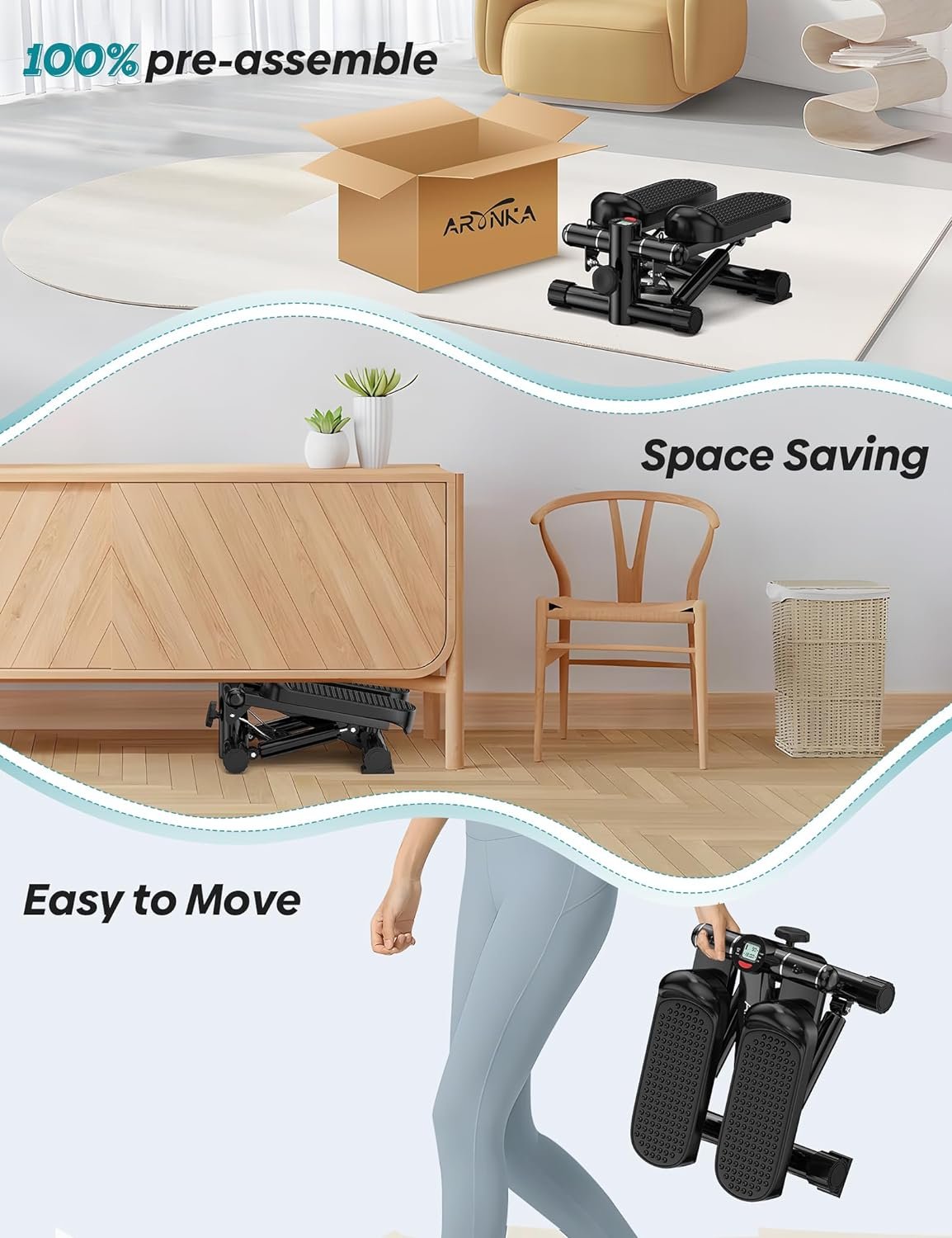 🔇【Smooth and Quiet Design】 Arvnka stepper utilizes a smoother and quieter hydraulic system. The base of the stair stepper feature 3D shock-absorbing pad, ensuring a quiet exercise experience at just 30 DB, minimizing disturbance to others.