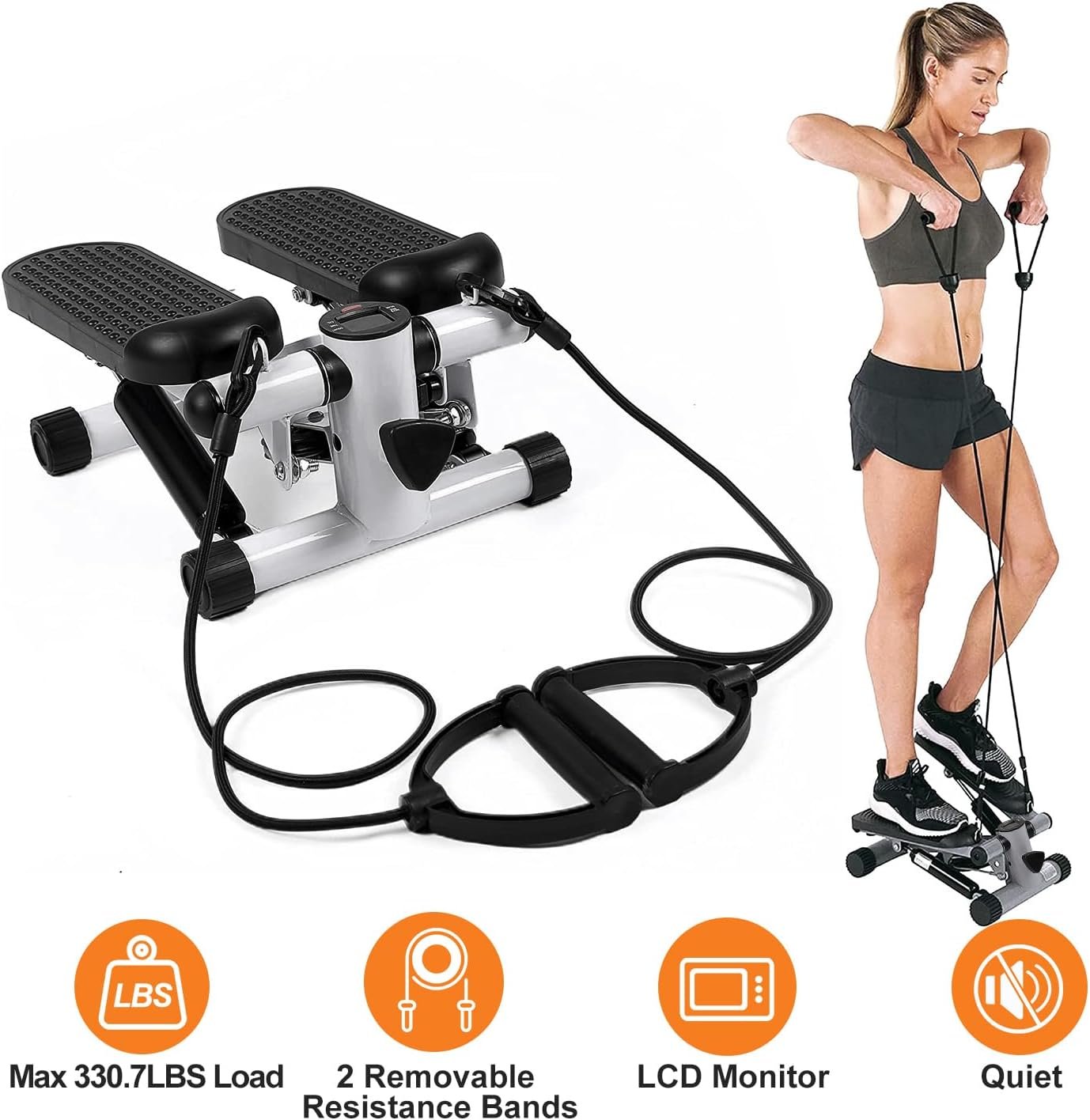 【Full Body Workout】Mini Stepper equipped with 2 removable resistance bands to provide a comprehensive workout, helping to tone your arms, shoulders, back and chest muscles. Perfect for for weight loss, slim legs, buttock lifting, body shaping etc.