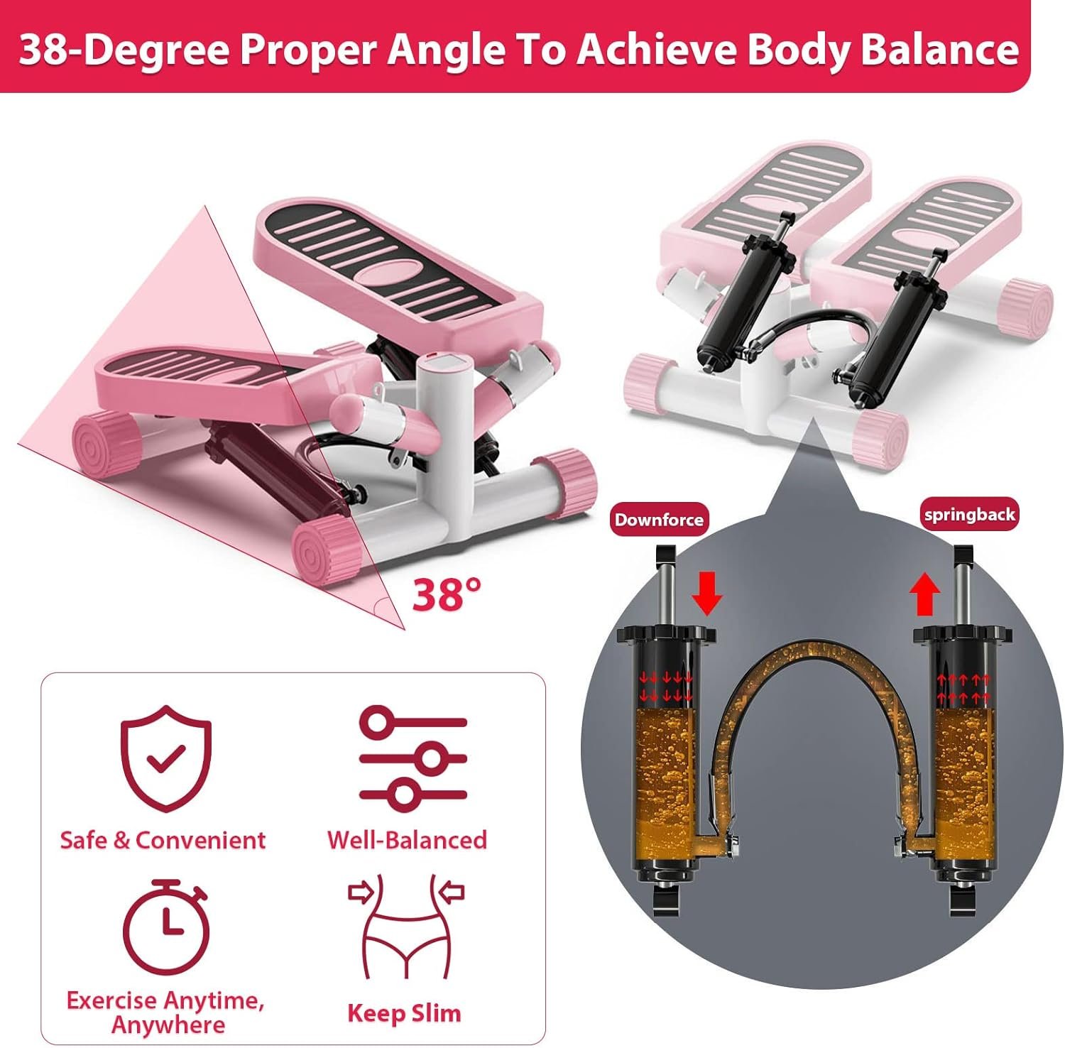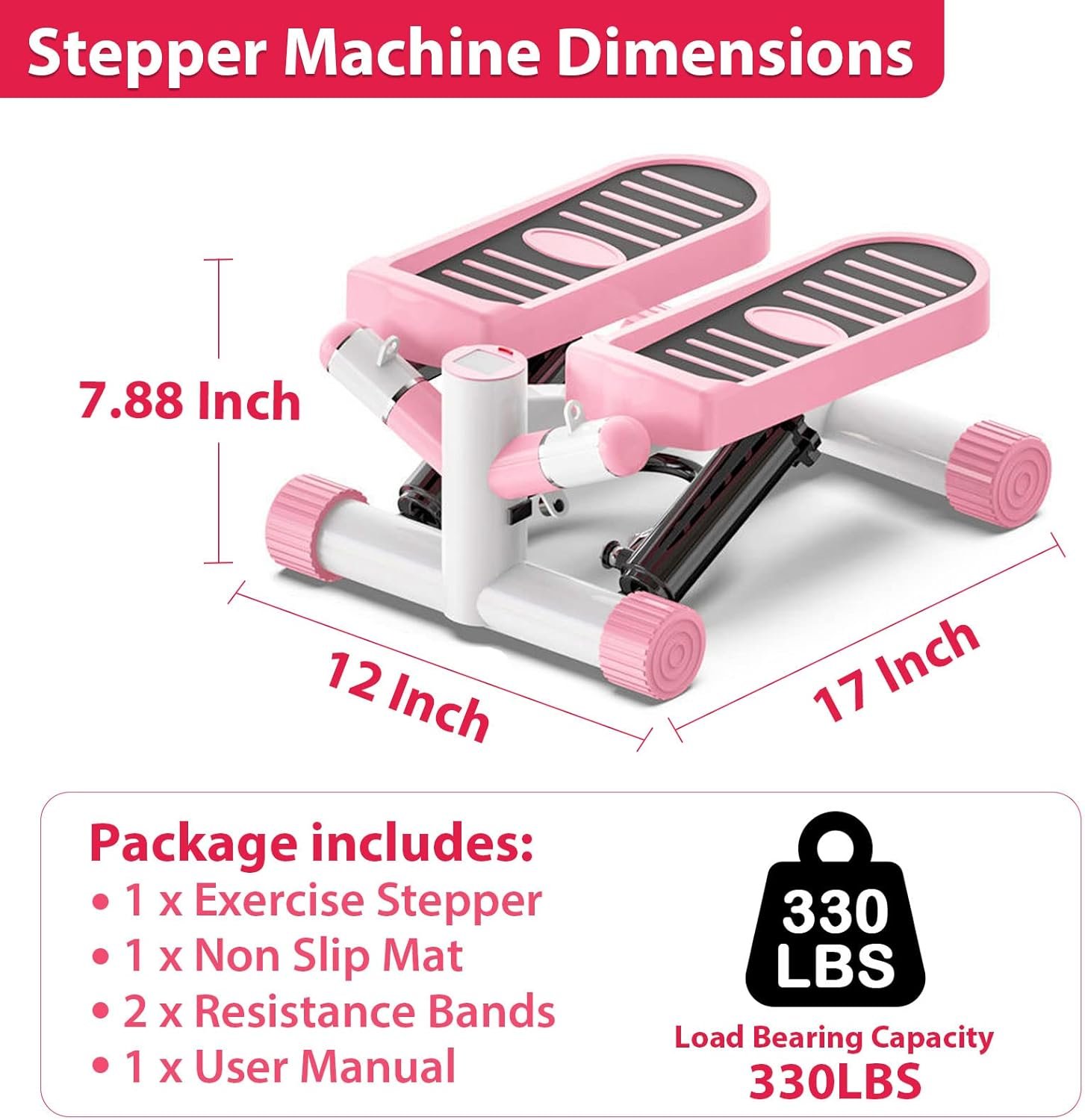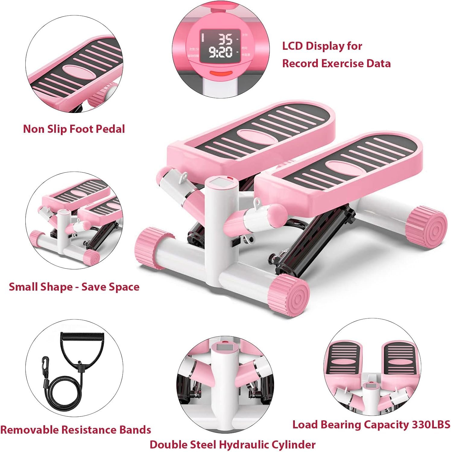 🏃♀️【Stable Hydraulic Drive System & 330lbs Capacity】- The mini steppers for exercise uses upgraded hydraulic drive systems, The built-in cushion springs and scientific up and down angle can protect your joints. The unique design make the step machines load bearing capacity up to 330 Ibs, The mini stepper adopts advanced metal material transmission that the noise can be lower than 20db, No disturbing others and enjoy your own aerobic exercise.