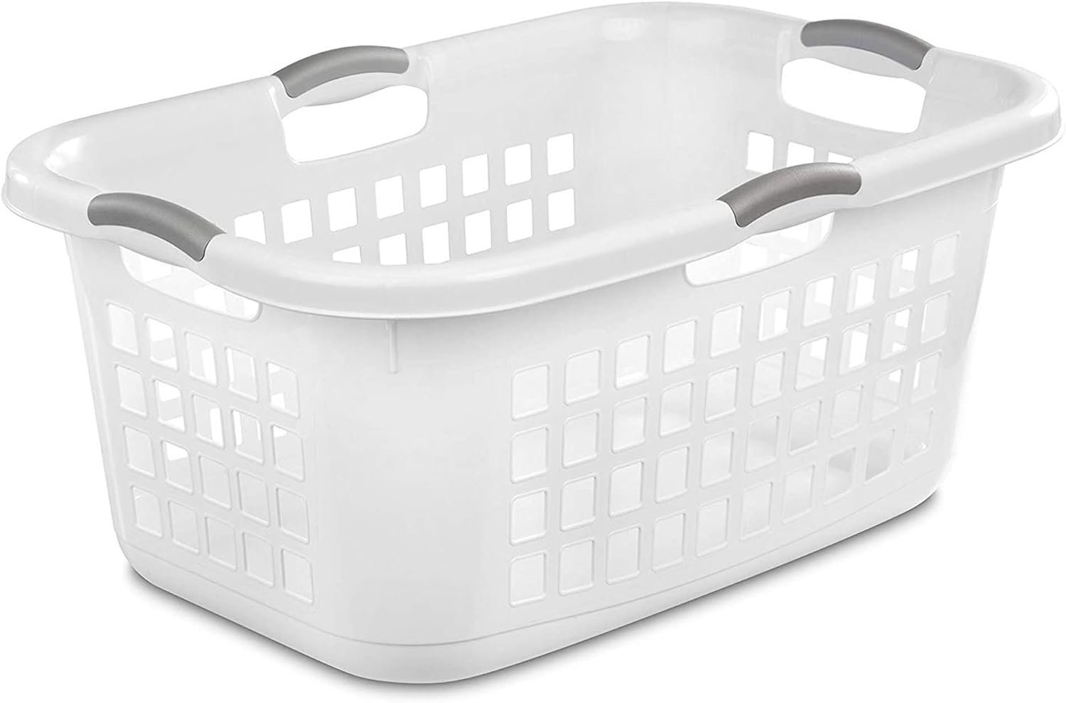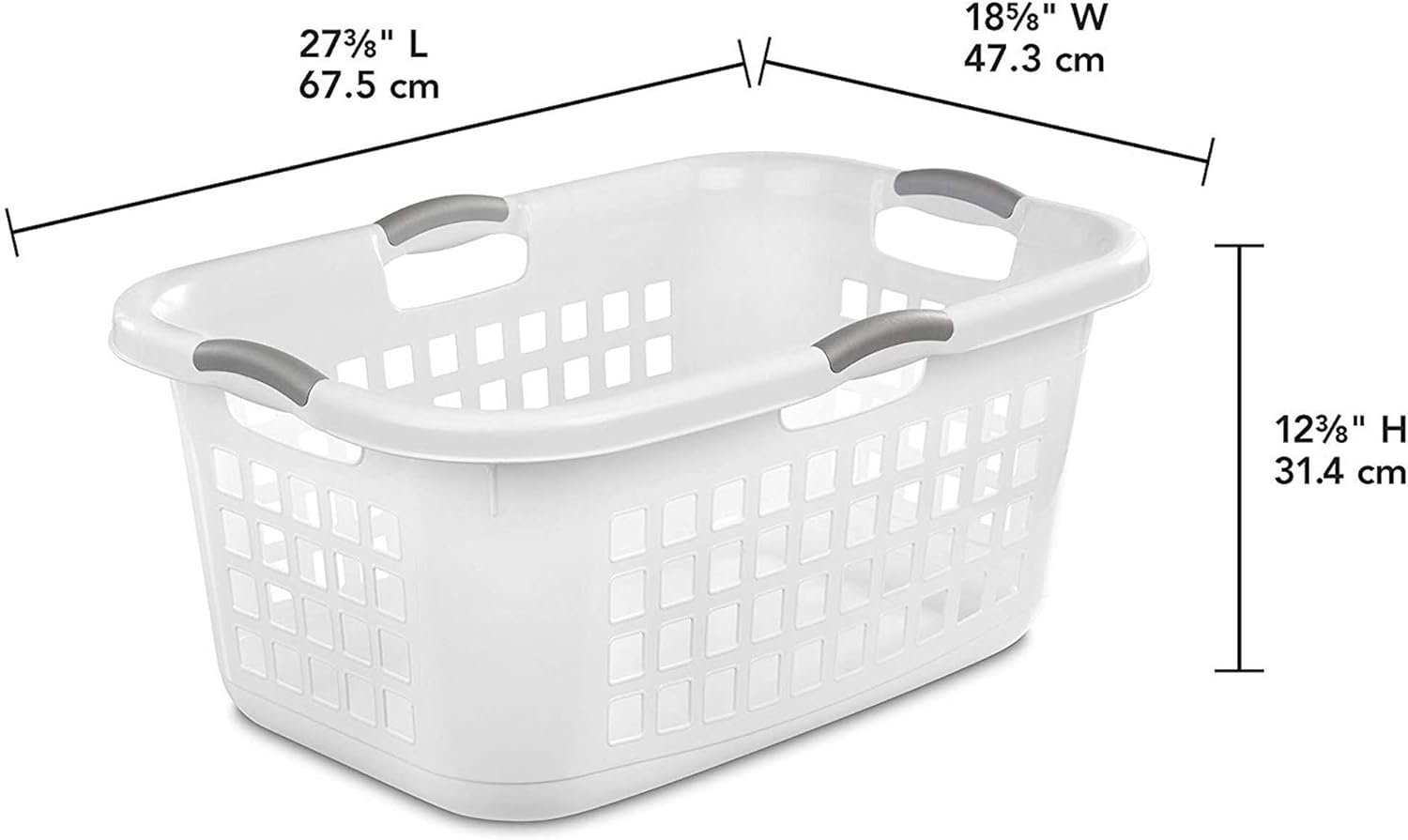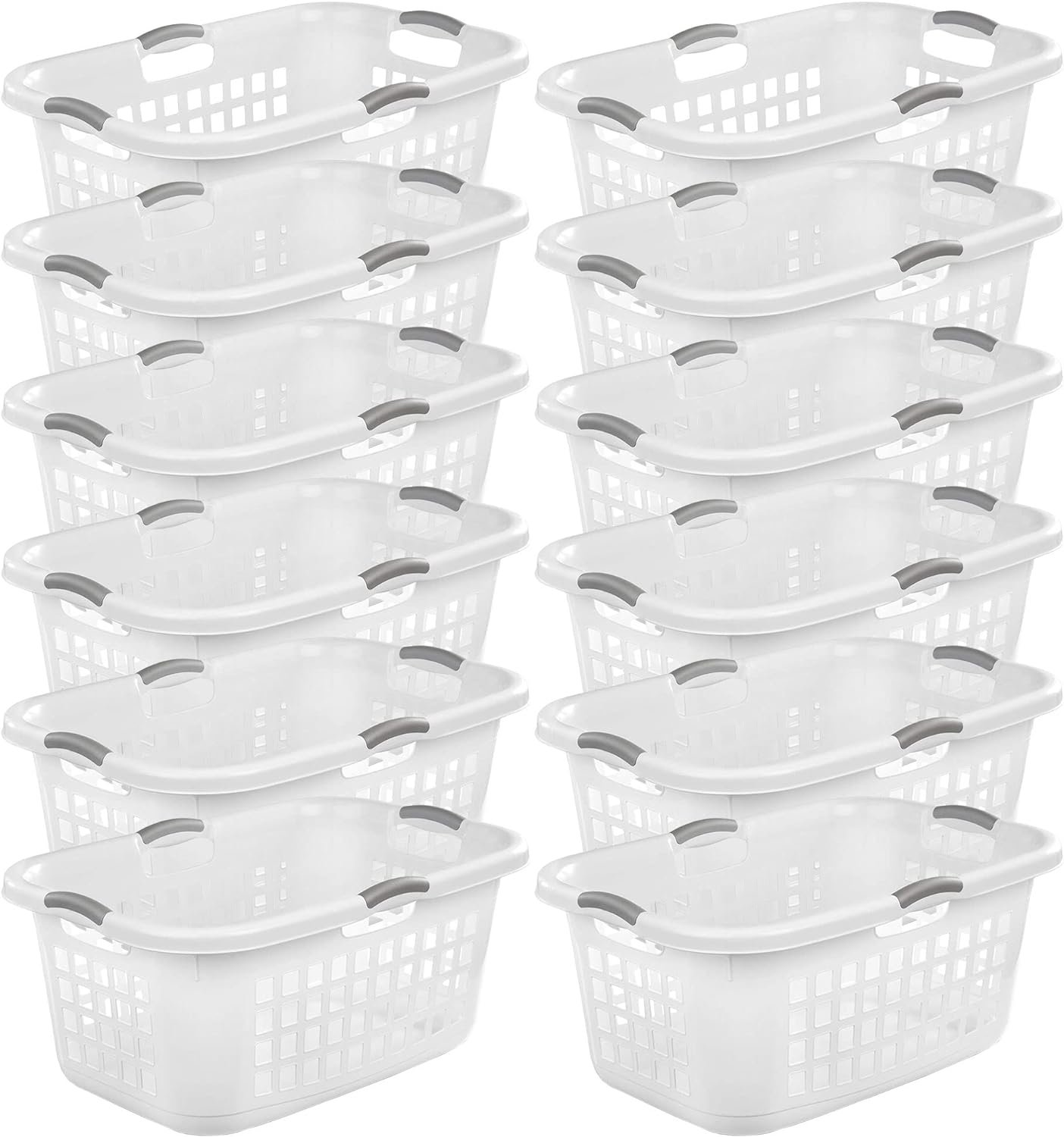 Make laundry day easy with this set of 12 Sterilite Ultra 2-Bushel 71-Liter Laundry Baskets. With a generous 2-bushel (71-liter) capacity, these laundry baskets make it easy to carry, sort, and fold clothes, towels, and sheets. This package includes 12 laundry baskets. Each of these large laundry baskets has wide, rectangular openings that make for the comfortable loading and unloading of large amounts of laundry. Easily carry your clothes baskets from room to room thanks to the 4 newly-designed handles that offer a comfortable carrying grip at any angle. The laundry bins also have sturdy rims that provide added strength. When not in use, these laundry baskets stack neatly and nest together creating more efficient storage space in your home. The large, square hole pattern increases airflow for added ventilation and matches any home decor style. Overall, each plastic laundry basket measures approximately 27 inches long, 19 inches wide, and 12 inches tall. Look forward to laundry day with this set of 12 Sterilite Ultra 2-Bushel 71-Liter Laundry Baskets.