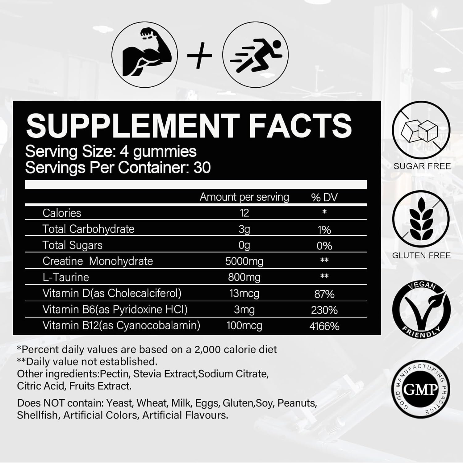 [Advanced Formulation]: Our creatine monohydrate gummies feature an advanced formulation that combines creatine with key nutrients such as L-taurine, B6, B12, and vitamin D, providing users with a comprehensive and synergistic blend for enhanced performance, recovery, and overall well-being.