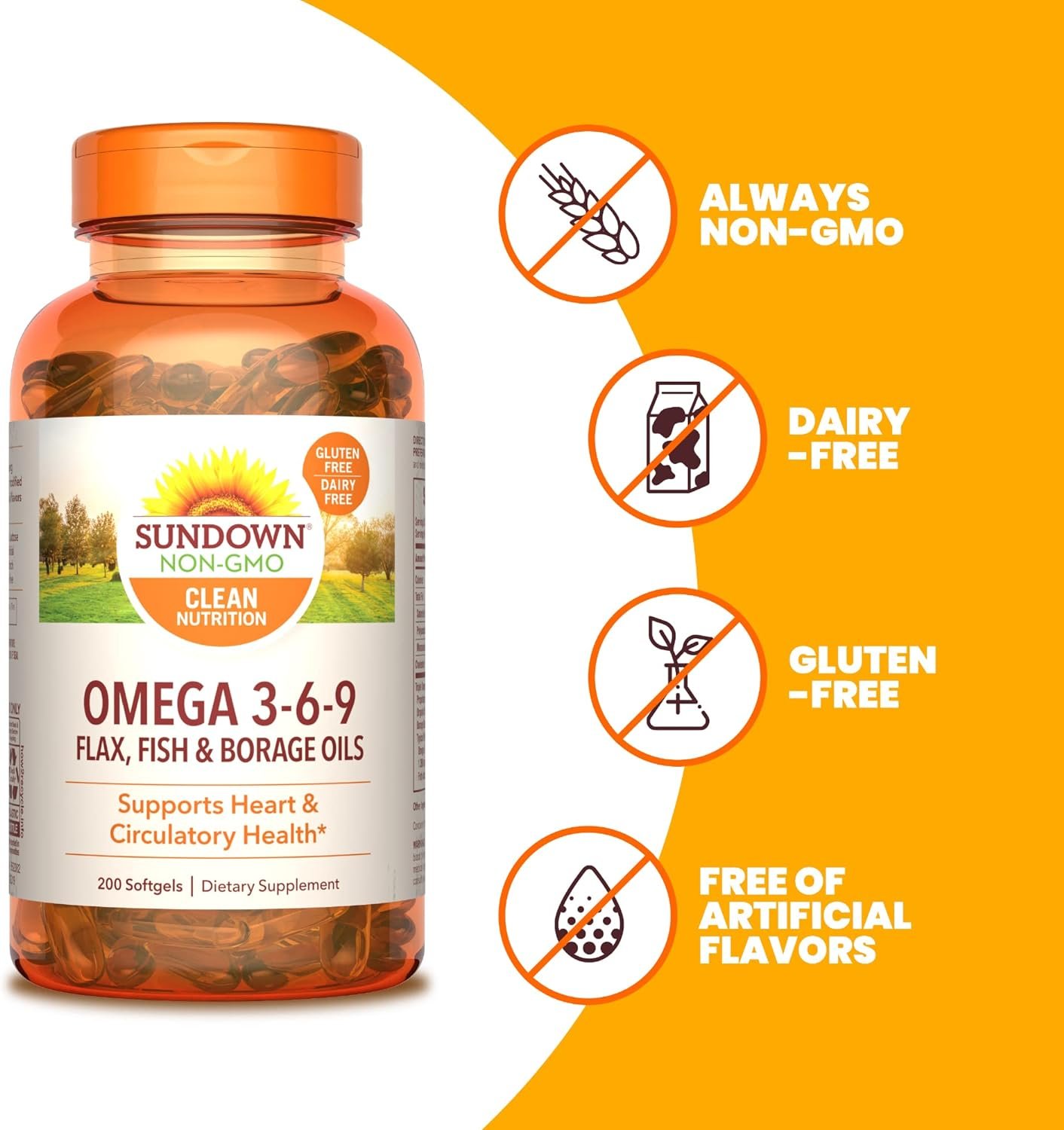 Sundown Omega 3 6 9, with Flax, Fish and Borage Oils, Supports Heart and Circulatory Health, 200 Softgels (Packaging May Vary)