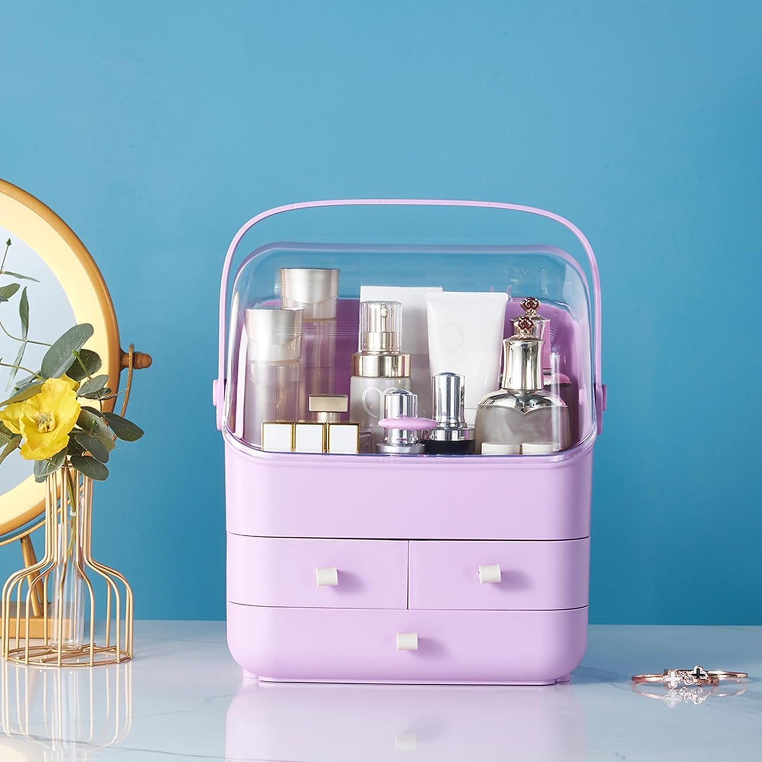 EASY TO ACCESS: The crystal-clear cover to keep your cosmetics away from dust and water. There are three divided drawers for brushes, jewelry, lipstick, and it keeps clutter away on the countertop. Faster access to your cosmetics helps give you an efficient makeup routine and prevents children or pets from access.