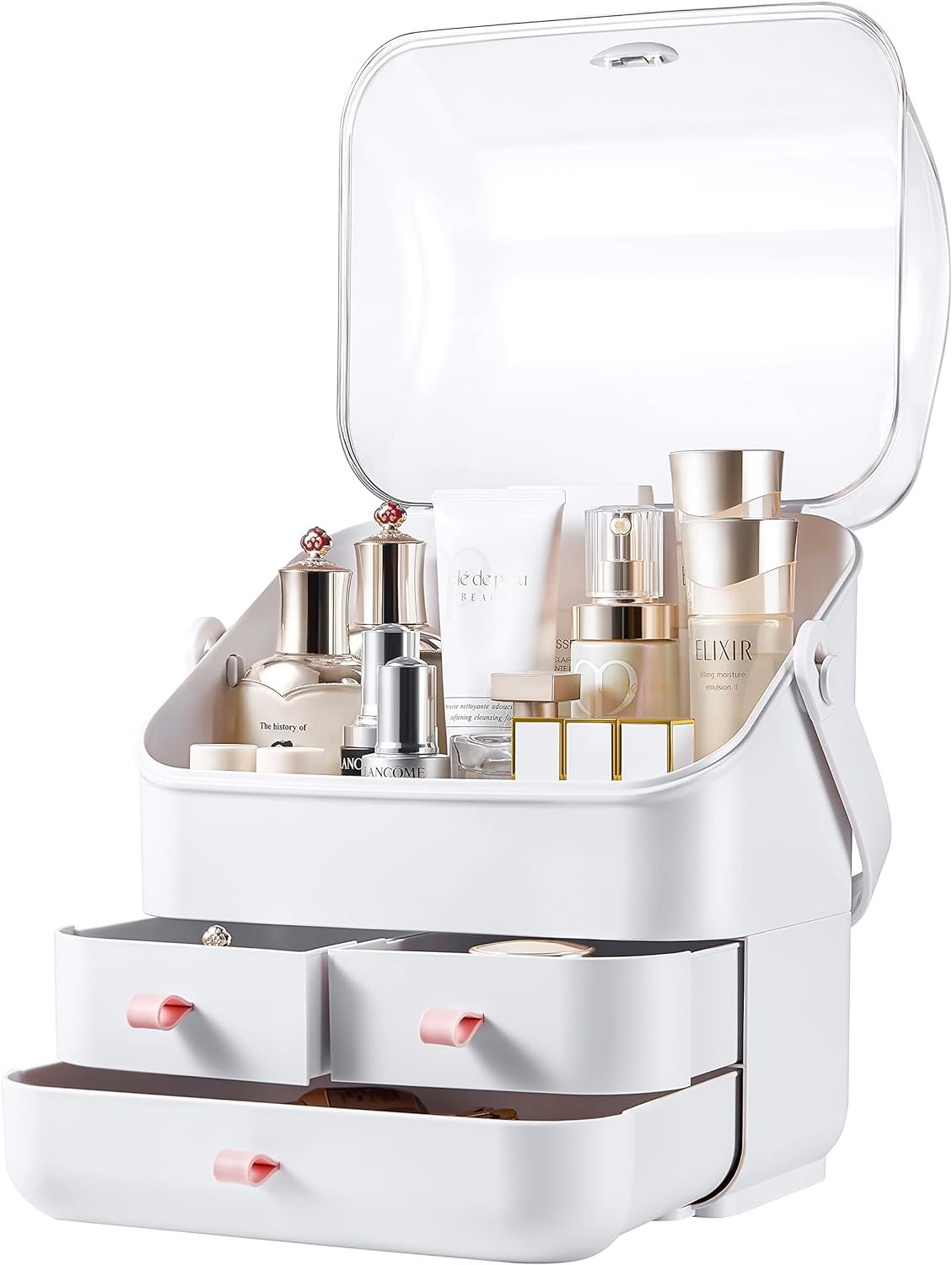 EASY TO ACCESS: The crystal-clear cover to keep your cosmetics away from dust and water. There are three divided drawers for brushes, jewelry, lipstick, and it keeps clutter away on the countertop. Faster access to your cosmetics helps give you an efficient makeup routine and prevents children or pets from access.