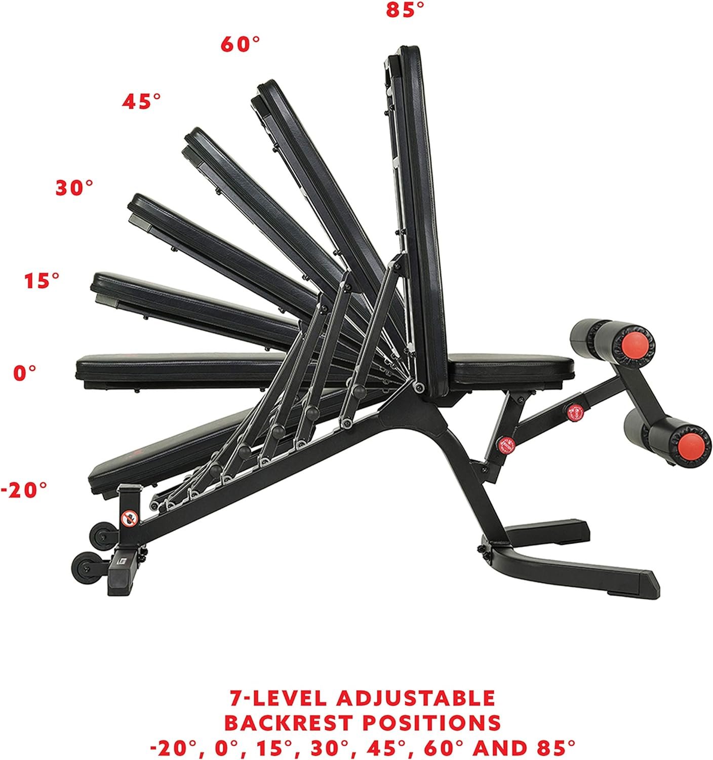 BACKREST SETTINGS: This weight bench has 7 adjustable positions(-20°, 0°, 15°, 30°, 45°, 60°, 85°) for a variety of workout options.