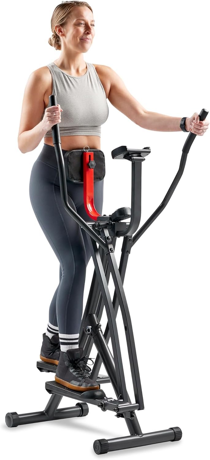 Sunny Health & Fitness SF-E902 Air Walk Trainer provides an aerobic workout, giving you all the benefits of stretching, walking, running, cross-country, skiing and aerobic dancing without jarring impacts or damaging movements to your body. This space saving Air Walker trainer folds to half the size, making it easy to put away in your closet or in a tight space. The striding motion delivers a slight twist to the midsection engaging both the upper and lower body. You’ll get a total body workout every time you workout!
