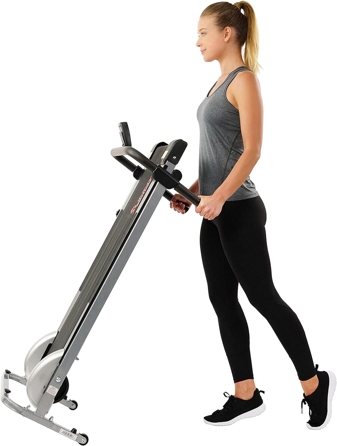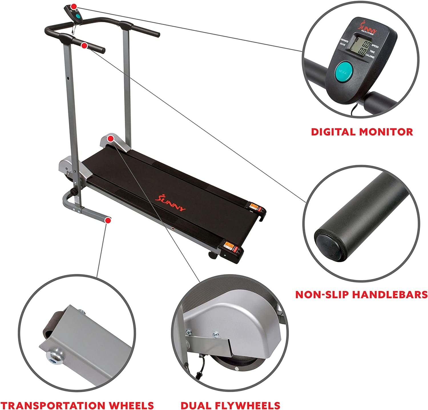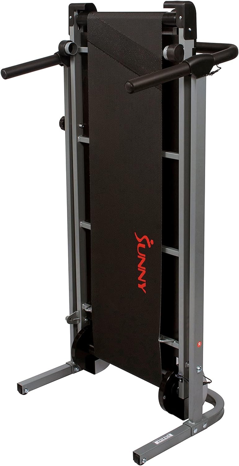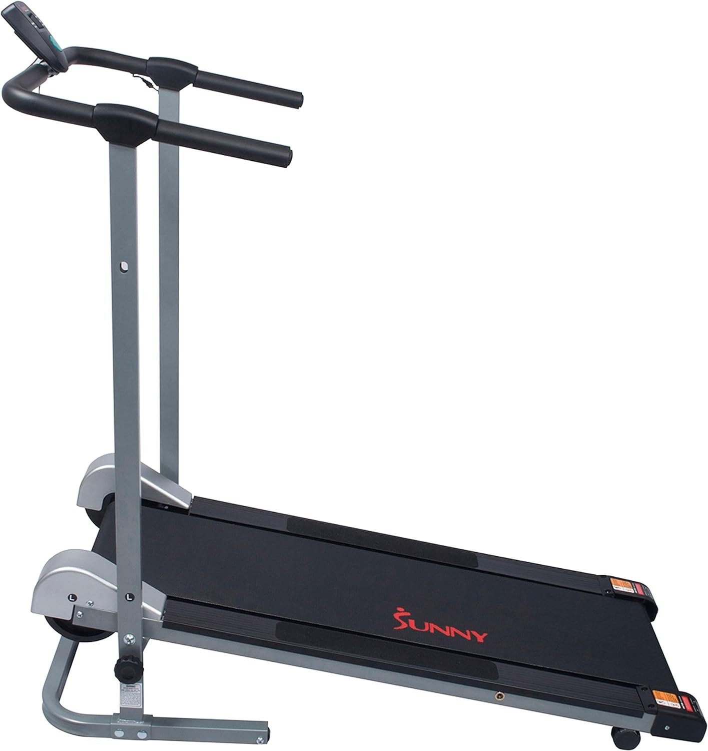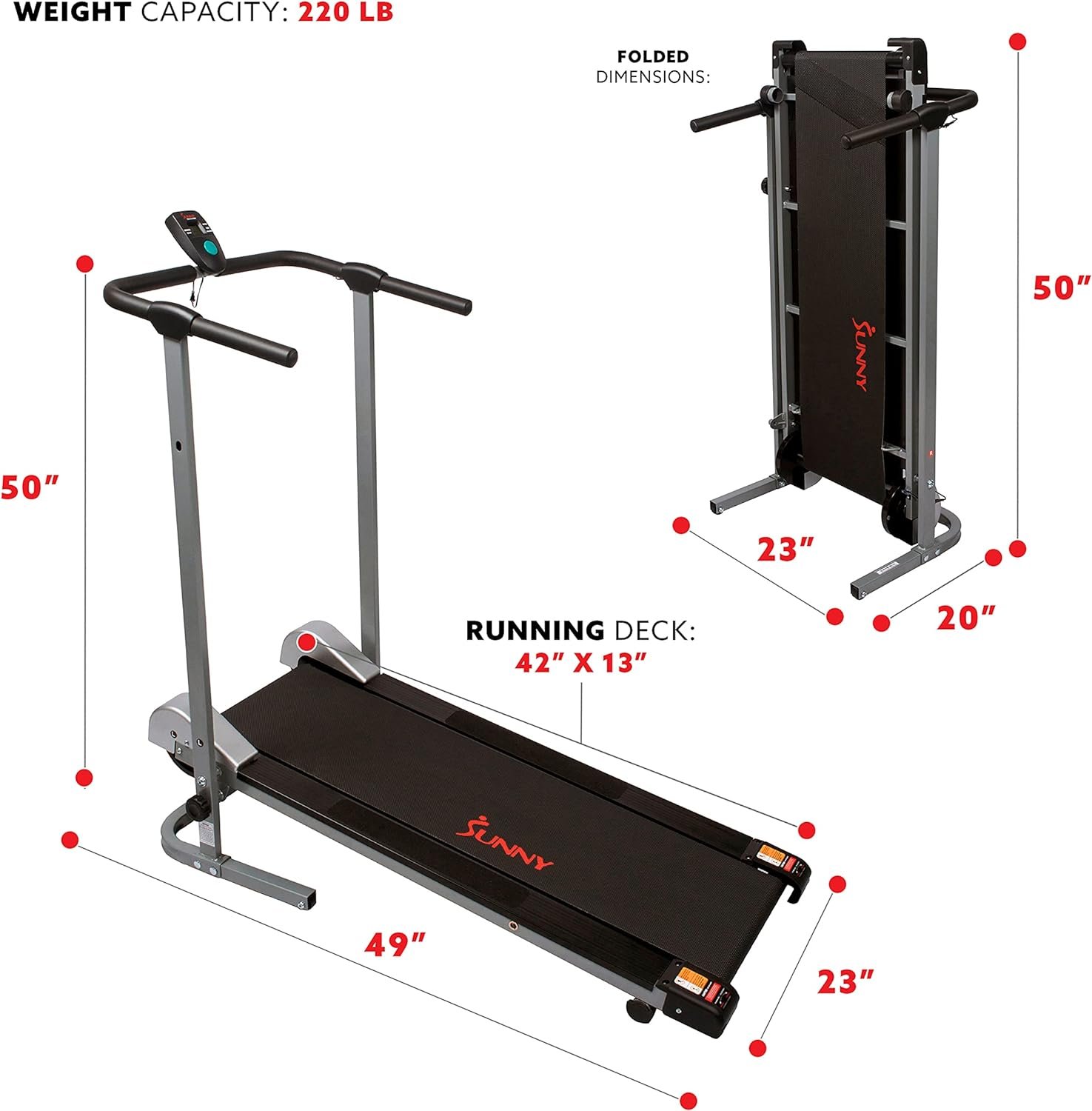 Begin your fitness journey and start walking on the SF-T1407 Manual Walking Treadmill by Sunny Health and Fitness. Improve health as you walk on the treadmill that requires no plugs or electricity. Simply get on and go! Hold onto the soft foam hand grips which allow you to maintain balance as you walk on the slightly fixed recline. The recline helps move the treadmill as you walk while also giving you a subtle challenge during walking. The compact walking treadmill is excellent for small studios or apartments. Dimensions: 49L x 23W x 50H in. The small treadmill can be easily folded and rolled away into a closet or from room to room. Folded Dimensions: 20L X 23W X 50H. Benefits of walking include an increase in blood circulation, strengthening bones and muscles, and an improvement in balance, mood, and coordination. After you complete your cardio session simply step off using the non-slip, gripped side railings. Keep track of all your fitness progress with the performance monitor. The fitness monitor tracks time, speed, calorie burn, steps, and scan. The sturdy frame supports a max weight of 220 lb. Health and wellness are just stepped away with the SF-T1407M Manual Walking Treadmill by Sunny Health and Fitness.