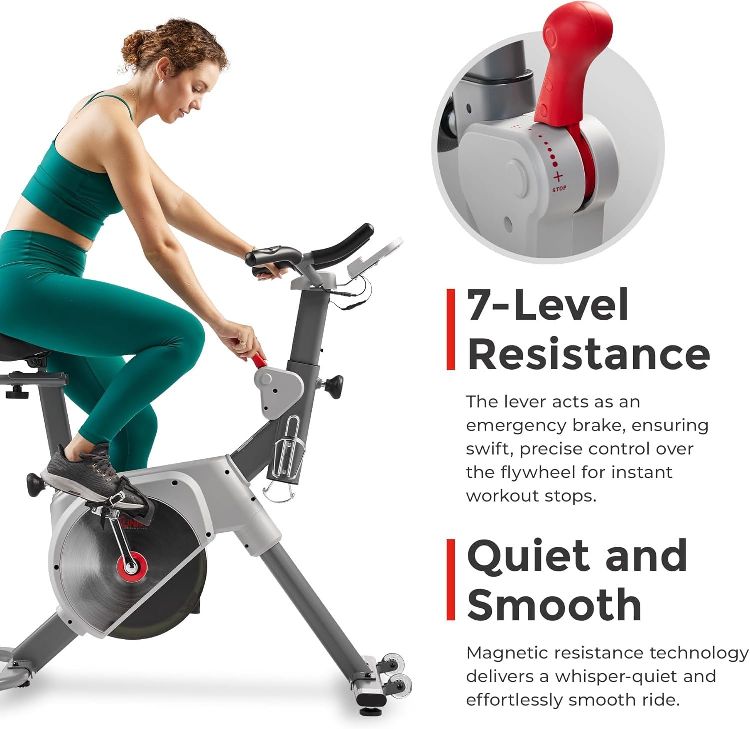 【EMERGENCY BRAKE】The 7-level resistance lever can function as an emergency brake when fully depressed. This design enables swift adjustments and precise control over the flywheel, allowing users to instantly stop their workout in case of emergency.