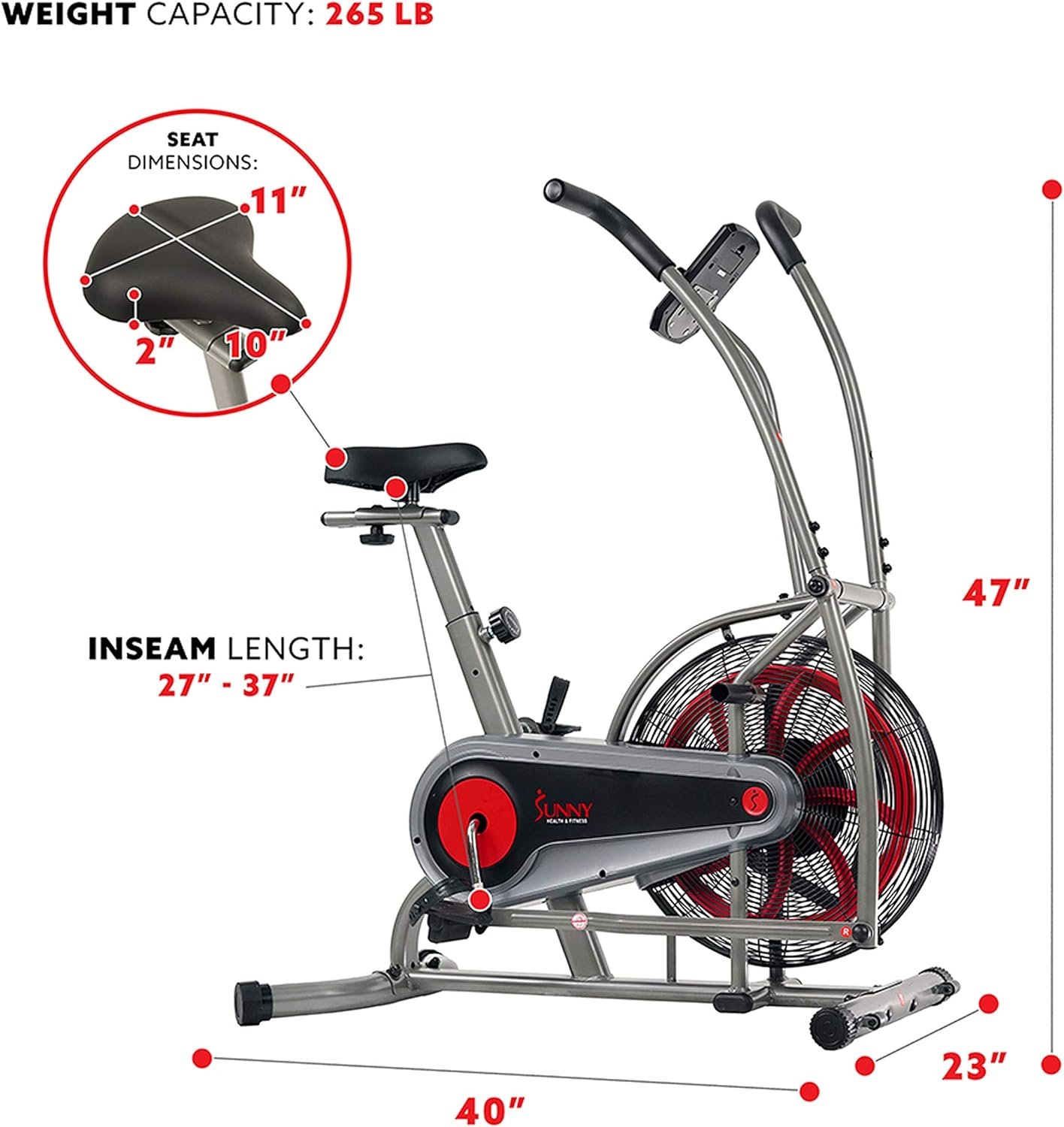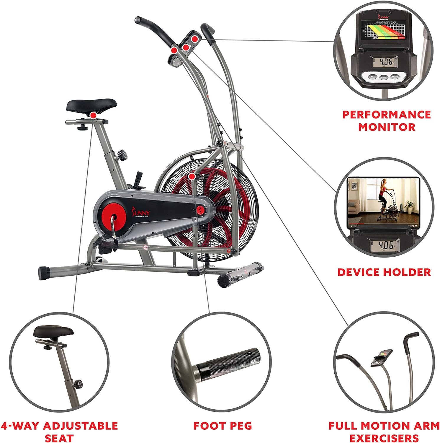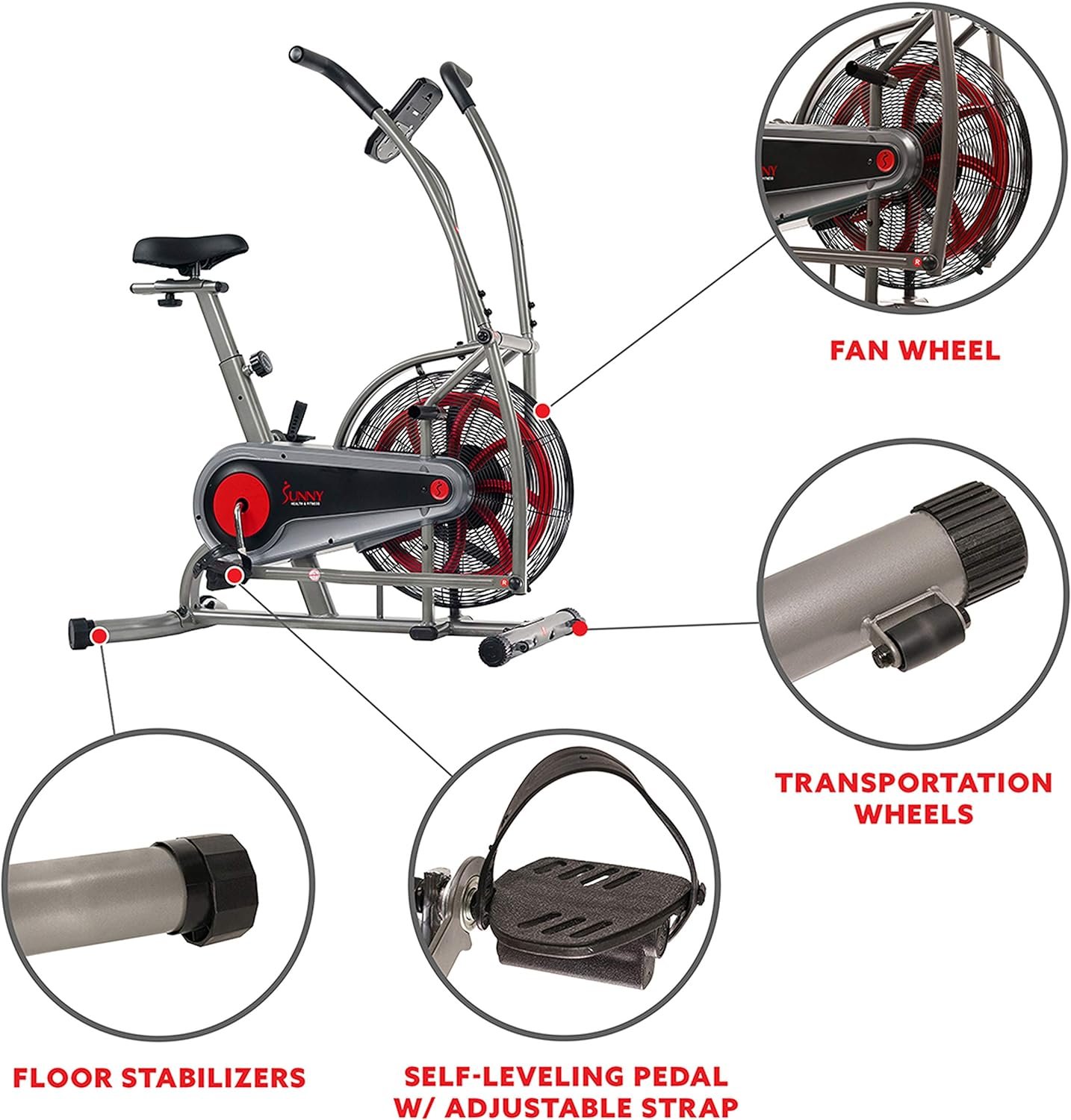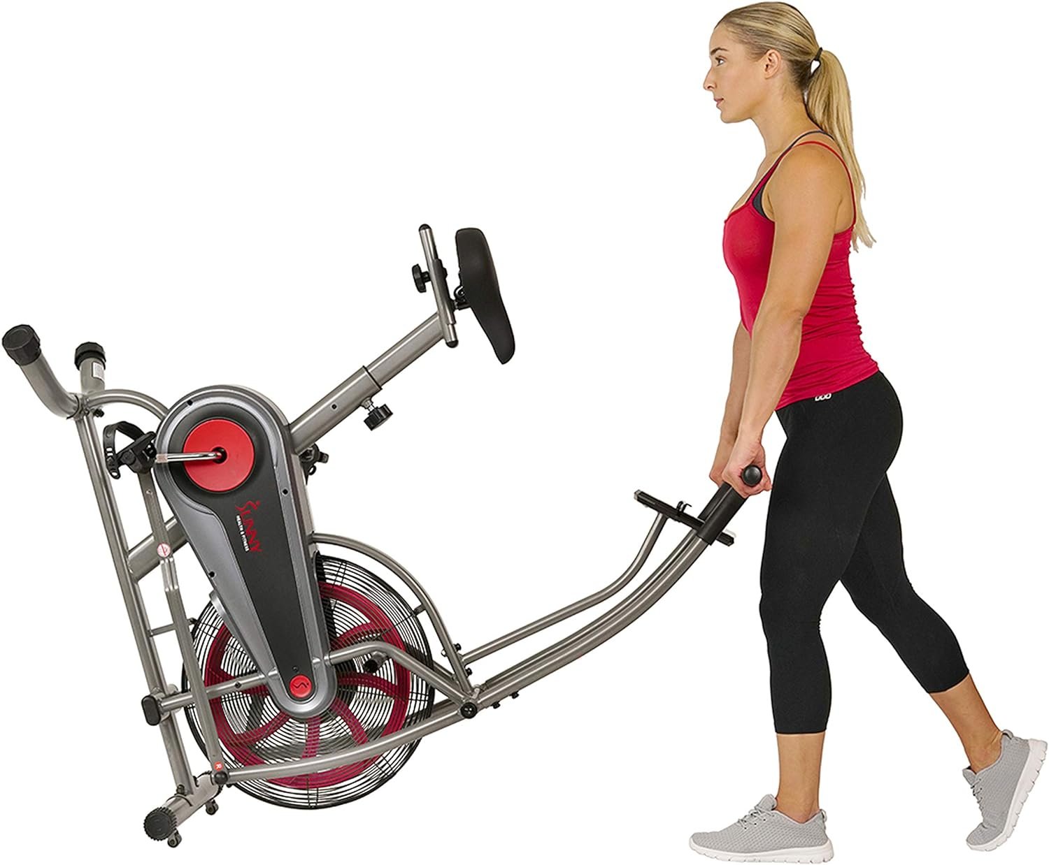 Breathe new life into your cardiovascular routine with the SF-B2916 Motion Air Bike by Sunny Health & Fitness. Start your ride when you sit on the 4-way adjustable bike seat that can accommodate a wide range of riders (leg inseam range: 27 inches to 37 inches). Slide your feet onto the wide foot pedals with straps for a secure fit while you exercise. Grab onto the padded handgrips to maintain stability while you engage the joint chain- and belt-drive mechanism. Achieve a full-body workout when you use the muscles in your upper and lower body to push and pull against the progressive fan resistance. The harder you push, the more resistance you’ll feel. Rest your feet on the supporting pegs while you push and pull to only working your upper body. Use the onboard performance monitor to track your speed, distance (kilometers or miles), time, and calories burned. Use the set mode to create goals for workout time, distance, and calories burned. Be in control of your workout entertainment when you place your personal device into the tablet holder. Feel confident during enduring workouts with the 265 lb weight capacity. Use the front transportation wheels to easily move the fan bike from room to room throughout your home.