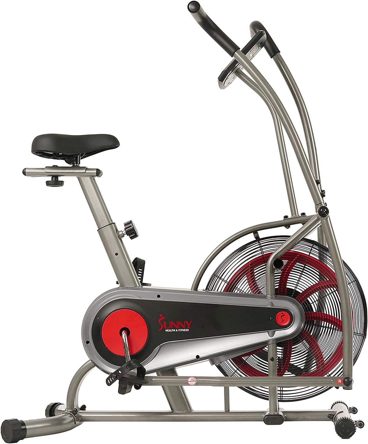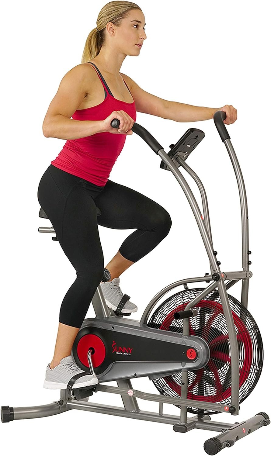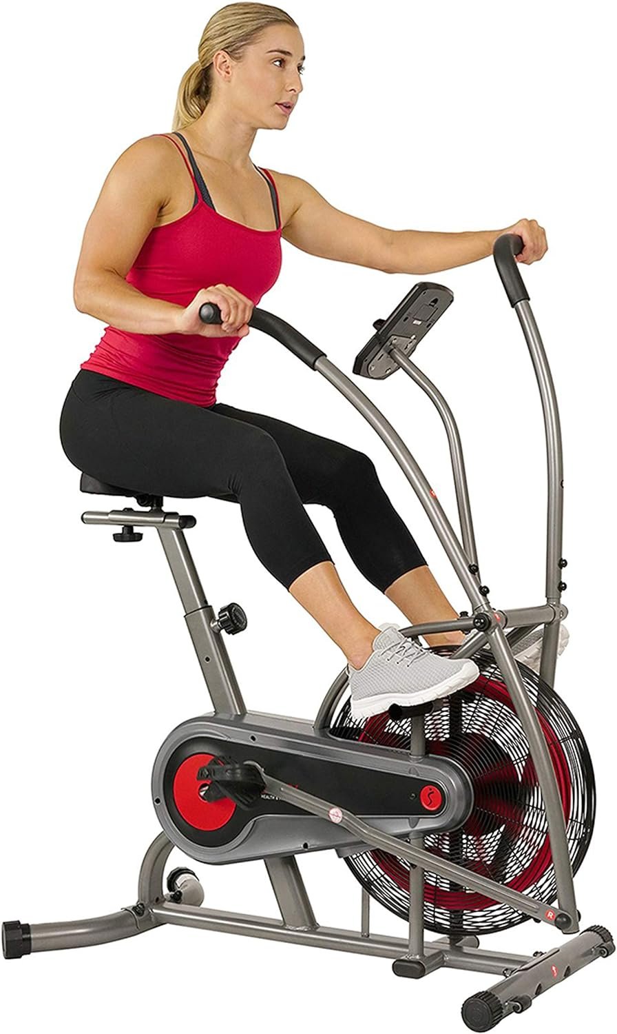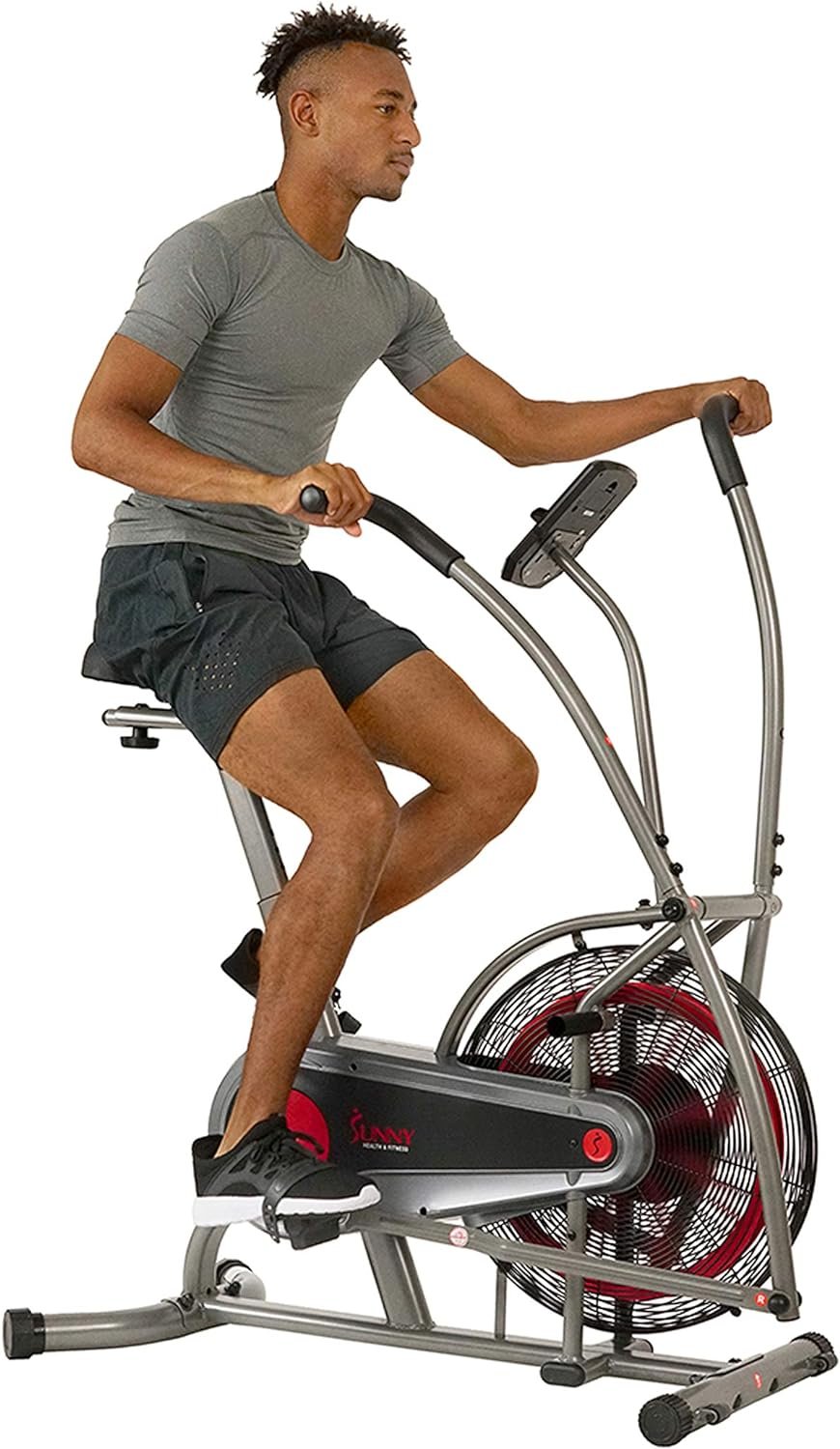 Breathe new life into your cardiovascular routine with the SF-B2916 Motion Air Bike by Sunny Health & Fitness. Start your ride when you sit on the 4-way adjustable bike seat that can accommodate a wide range of riders (leg inseam range: 27 inches to 37 inches). Slide your feet onto the wide foot pedals with straps for a secure fit while you exercise. Grab onto the padded handgrips to maintain stability while you engage the joint chain- and belt-drive mechanism. Achieve a full-body workout when you use the muscles in your upper and lower body to push and pull against the progressive fan resistance. The harder you push, the more resistance you’ll feel. Rest your feet on the supporting pegs while you push and pull to only working your upper body. Use the onboard performance monitor to track your speed, distance (kilometers or miles), time, and calories burned. Use the set mode to create goals for workout time, distance, and calories burned. Be in control of your workout entertainment when you place your personal device into the tablet holder. Feel confident during enduring workouts with the 265 lb weight capacity. Use the front transportation wheels to easily move the fan bike from room to room throughout your home.