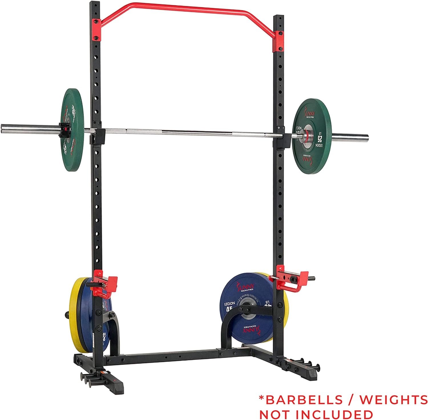 Sunny Health & Fitness Power Zone Squat Stand Power Rack Cage With Spotter Arms, J-Hooks, Adjustable Pull Up Bar Optional Bench with Dumbbell Rack, Premium Incline Bench, LAT Pull Down Attachment