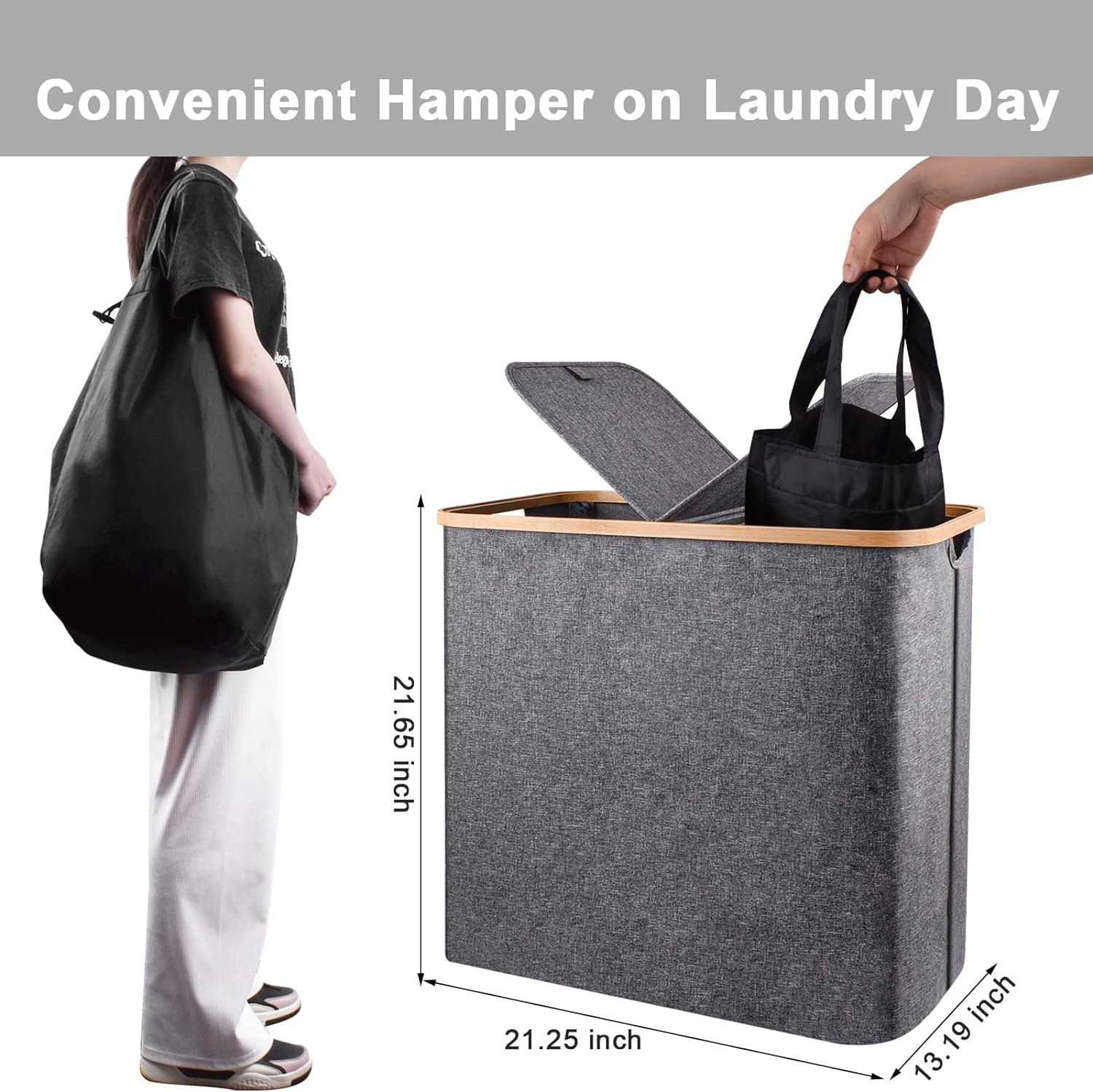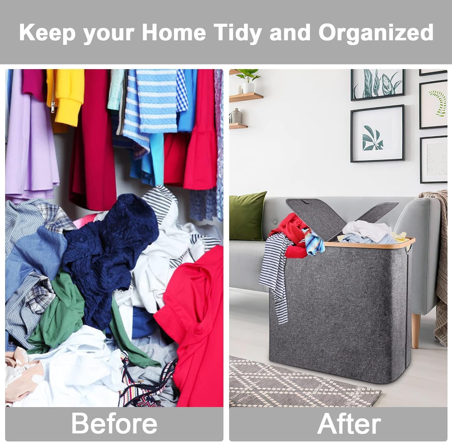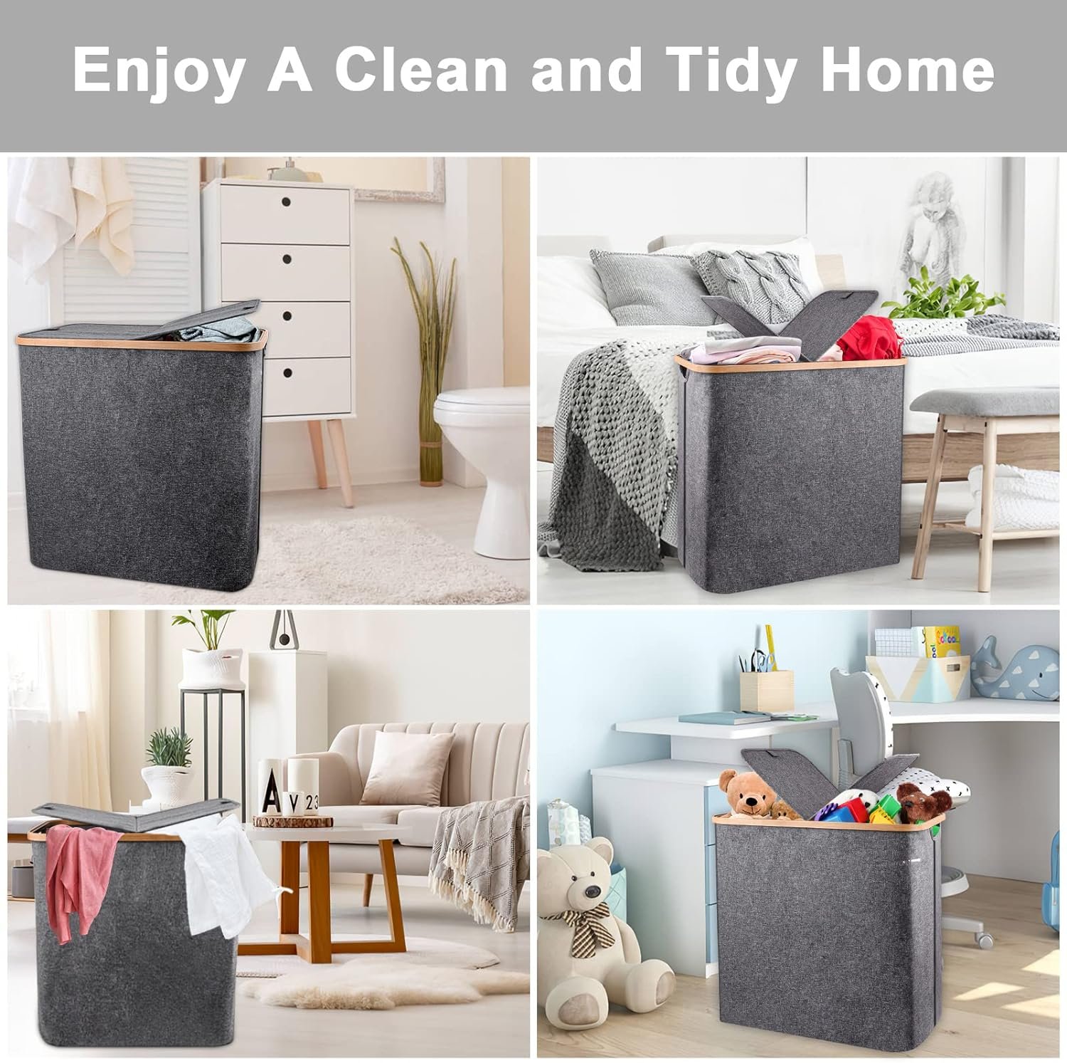 【Laundry Hamper with Lid Essential for Home Storage】Double laundry hamper with lid can meet all your home storage needs. A fixed lid of the hamper makes it easy to open and close. Sturdy hamper lid to conceal any odors at bay and keep the dirty clothes out of sight, making your space look nicer and tidy. It is ideal to hide away clothes from guests