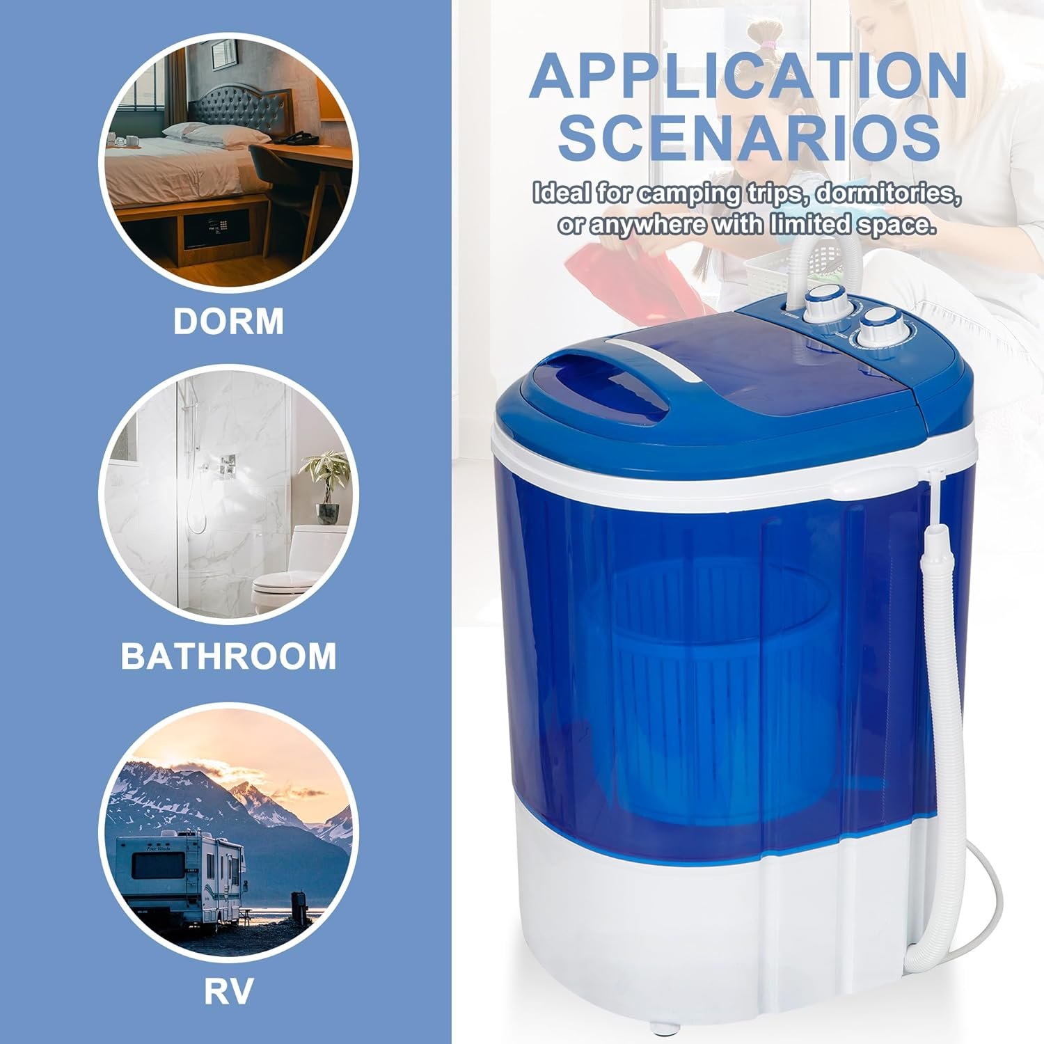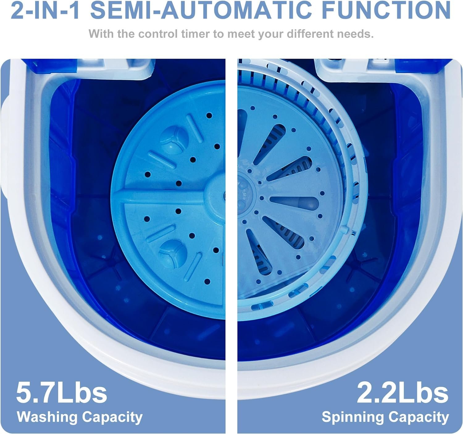 Color: BlueDimension: 14.6″L×14’’ W×22″ HNet Weight: 12.35 LbsVoltage:110V/60HzWashing Capacity: 5.7LbsSpinning Capacity: 2.2Lbs Length of inlet pipe: 45.3″Length of drain pipe: 17.7″Length of power cord: 70″ Why MINI Single Washing Machine is Good