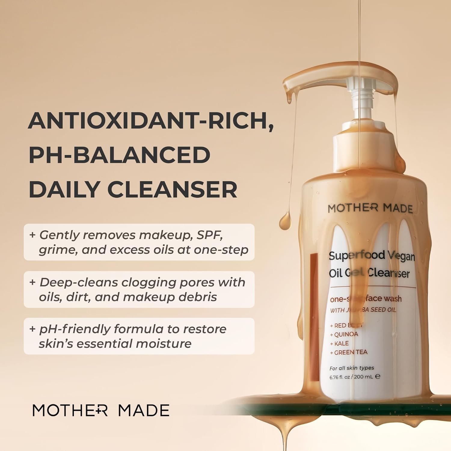 Multi-function Cleanser : Antioxidant-packed, pH balanced & natural oil-infused rich gel cleanses skin and removes facial & eye makeup, sunscreen, daily impurities with ease in one step. Gentle enough for all skin types and doubles as a makeup remover