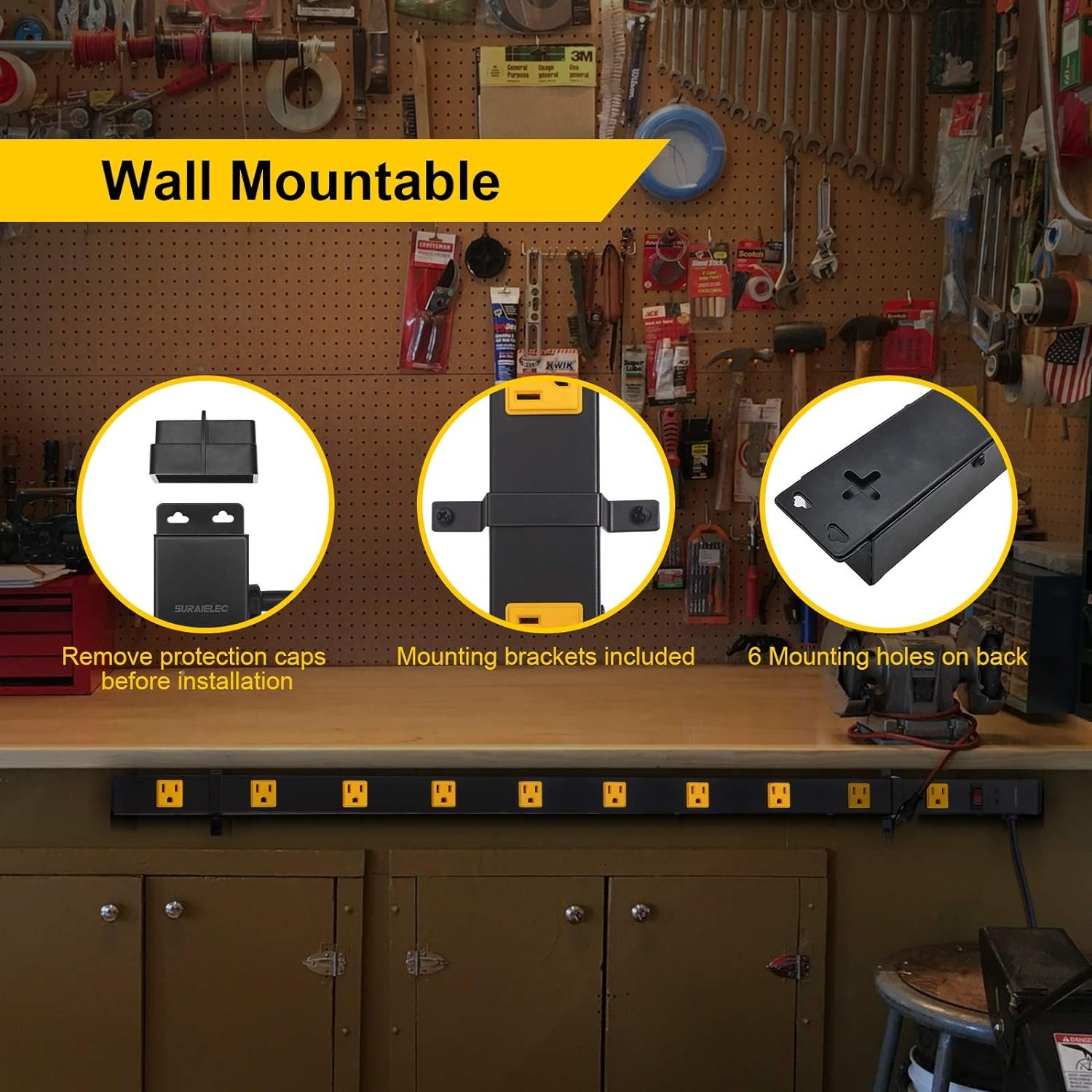 【 15A/1875W Heavy Duty Power Strip 】 Durable black and yellow full metal housing, 14 AWG /3C gauge cord, 15A / 125V / 1875W high power; perfect for various power tools, chargers, computers, monitors, printers, game consoles, and other more electronic devices with wall-wart power supplies that have to be plugged in