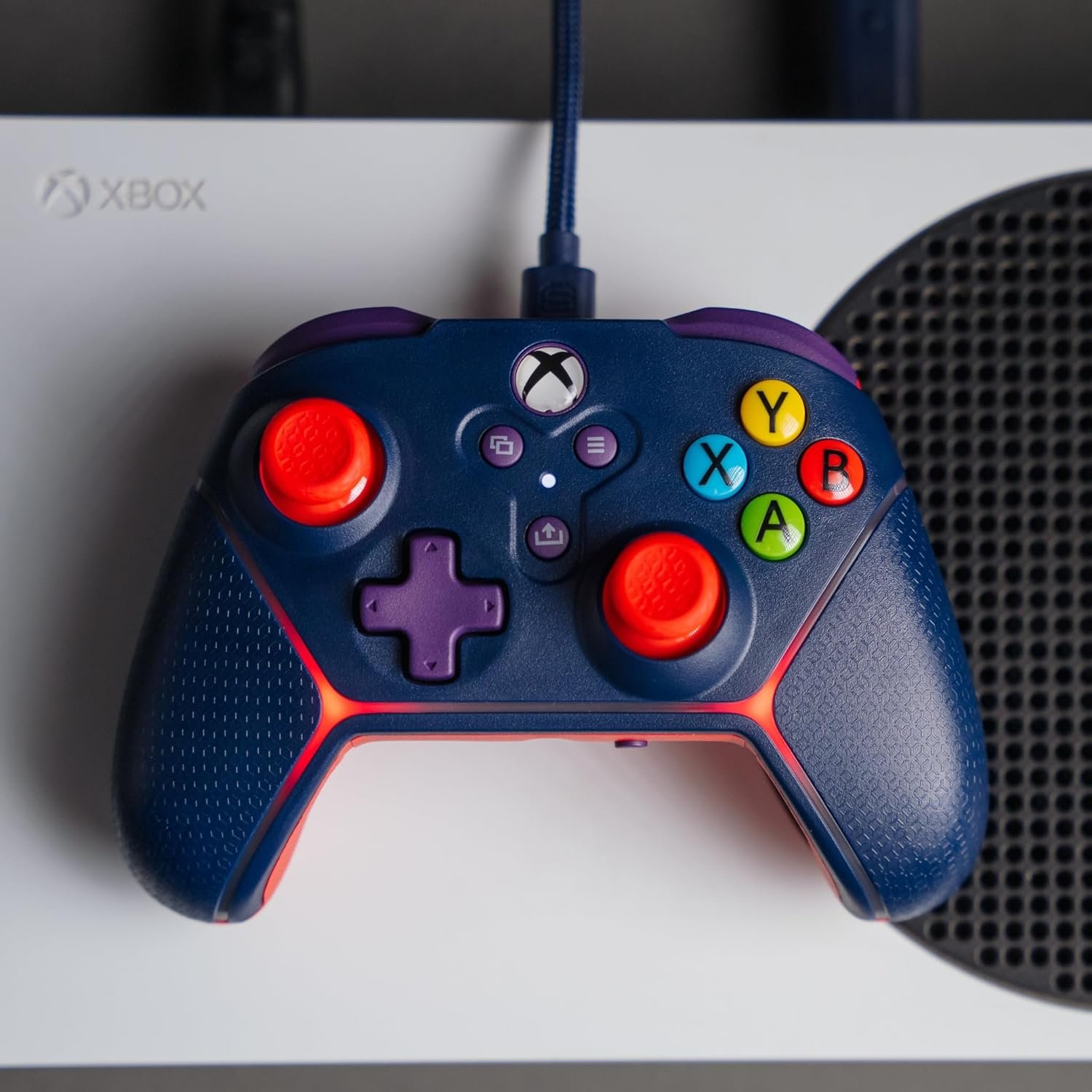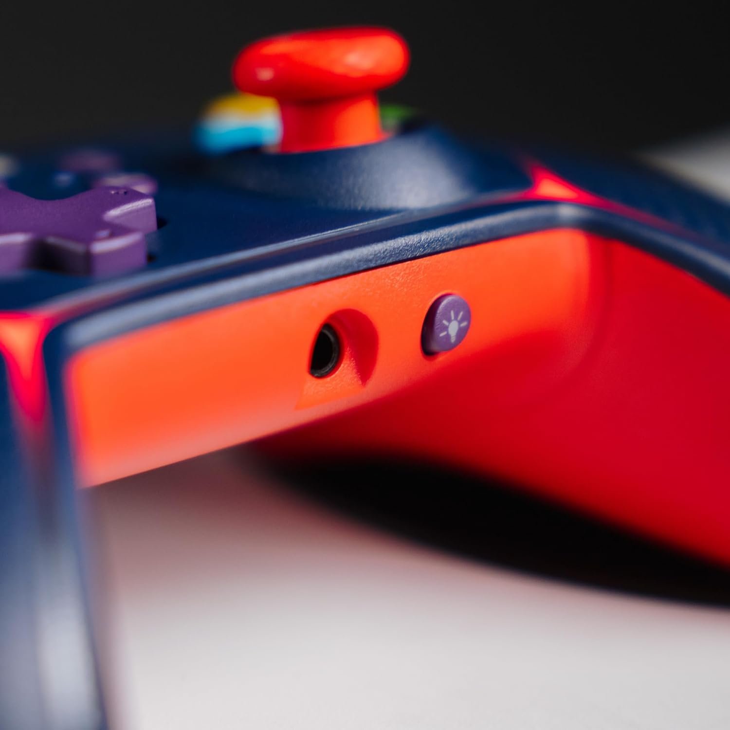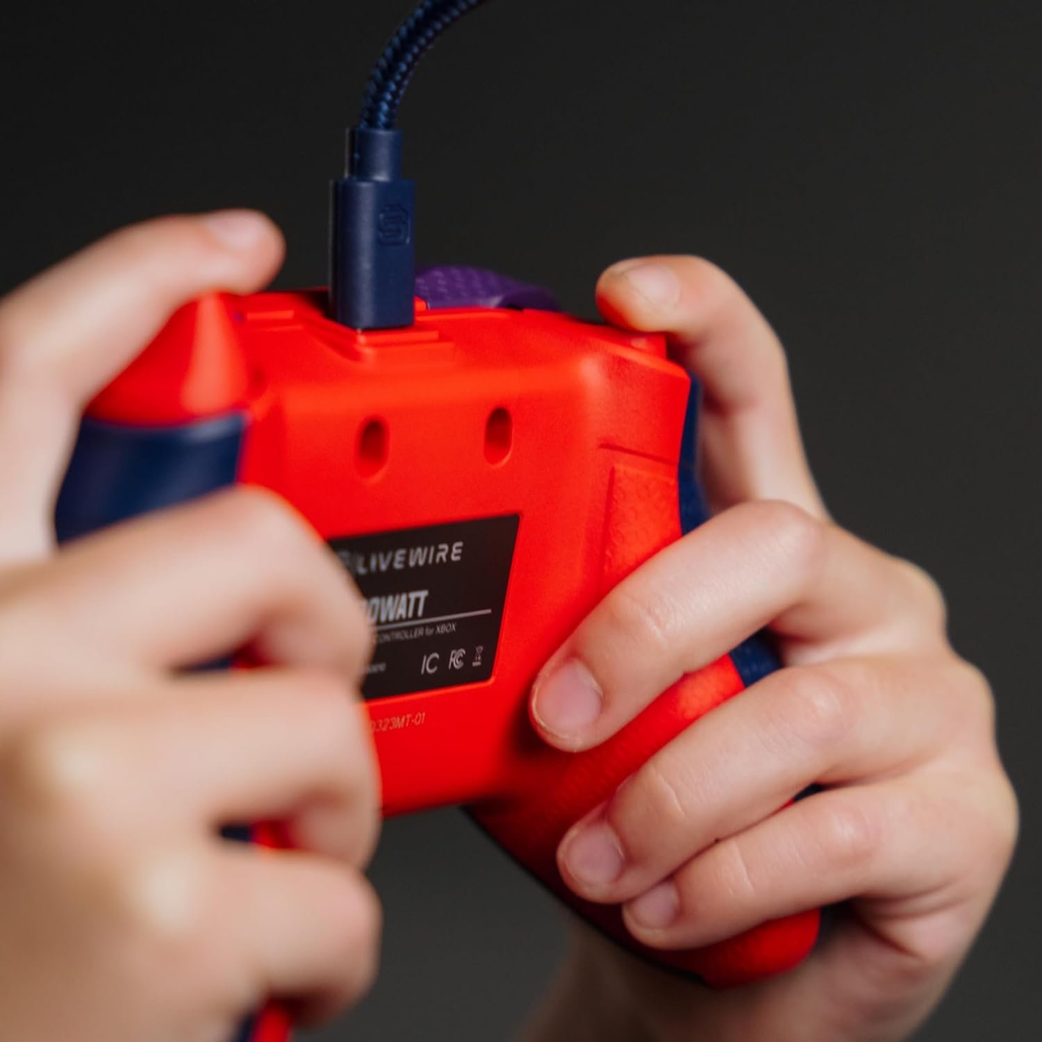 The Livewire Microwatt Controller offers full sized functionality in a 20% smaller size. Designed for younger gamers, the custom grip texture on the handles, triggers, and thumbsticks keeps you on target. The LED light bar and thumbstick underglow highlight your skills and can be adjusted to match your style. Dual rumble motors enhance your experience, and a 3.5mm audio port makes it easy to chat with friends. Equipped with a detachable 10-foot braided cable, the Microwatt is the perfect travel buddy, providing full functionality in a compact size.