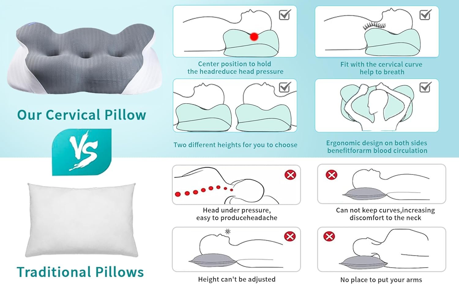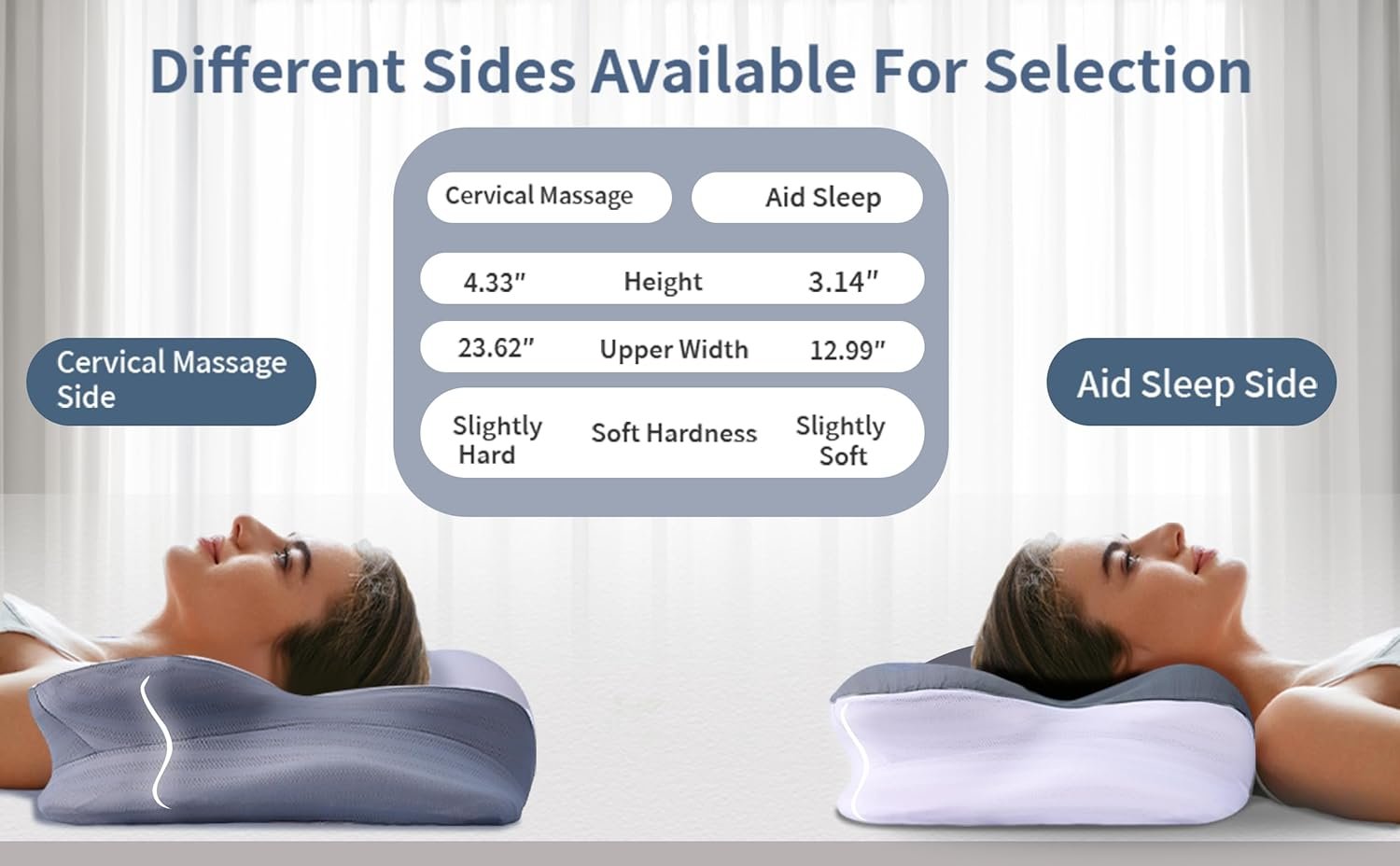 【Various Sleep Modes To Choose From —— Cervical Massage and Aid For Sleep 】The designer has created pillows with sleep patterns to choose from for two common situations, namely neck pain and insomnia:Sweet Moon pillow feature two sleep sides with different heights and hardness,three 3D support areas in the center suitable for side back stomach sleepers,and comfortable arm areas on both sides.By combining the slow rebound characteristics of selected memory cotton, Sweet Moon pillow can perfectly adapt to various situations and sleeping positions, allowing your body and mind to fully relax and recover during sleep.