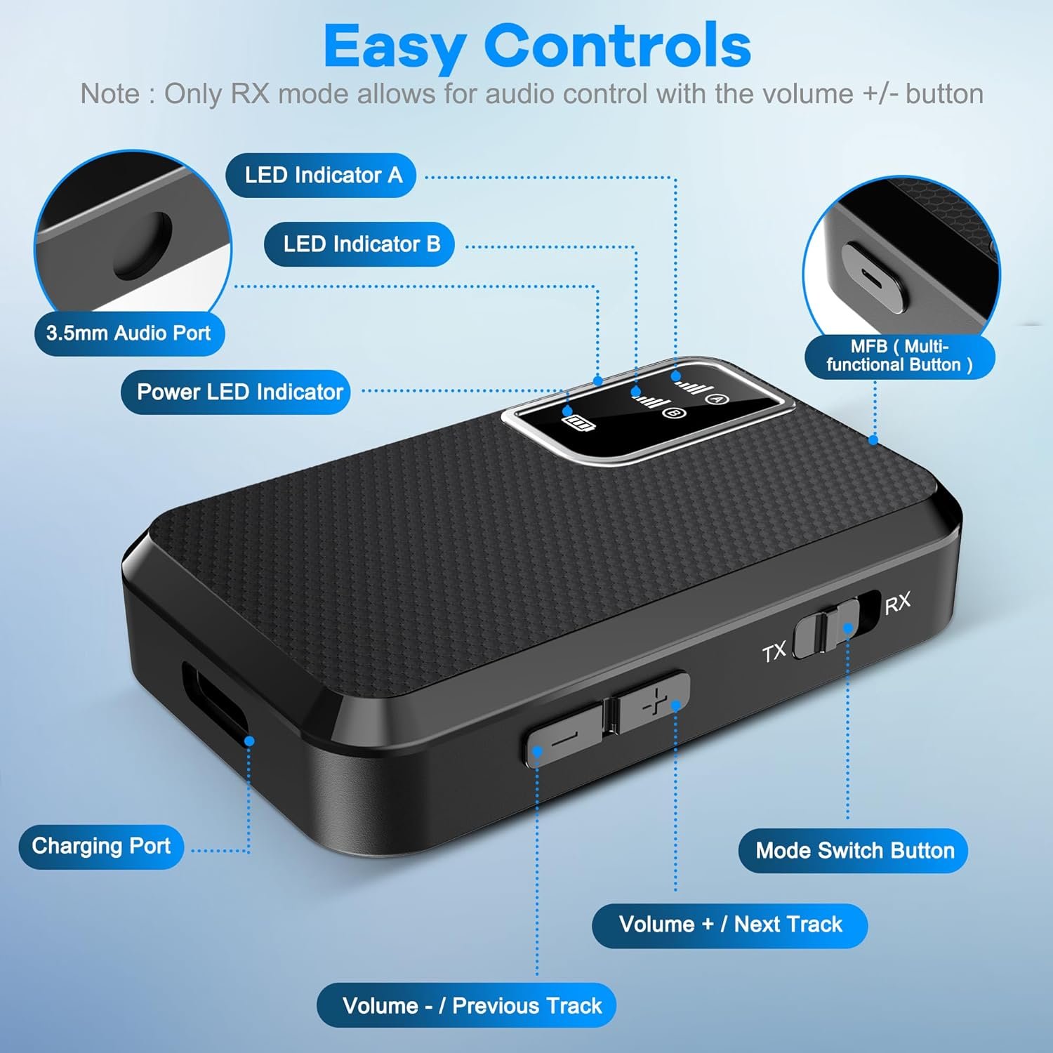 【Dual Pairing Mode with LED display】 Swiitech Bluetooth Transmitter Receiver can be paired with two devices at the same time in TX/RX mode. There are two signal display lights on the display screen. When device A is successfully connected, signal light A will remain on. When device B is successfully connected, signal lights A and B will remain on, helping you solve the connection problem.