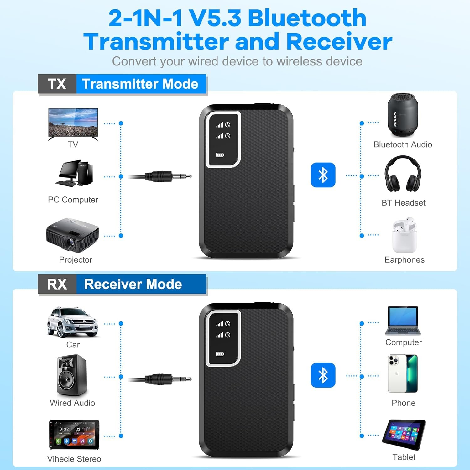 【2-in-1 Bluetooth Audio Adapter】 Swiitech Bluetooth audio transmitter has two usage modes: 1. In TX mode, the Bluetooth transmitter uses a 3.5mm (AUX/RCA) cable to connect an audio source (TV/MP3 player) without Bluetooth functionality to speakers/headphones/hearing aids with built-in Bluetooth functionality. 2.In RX mode, the Bluetooth receiver can transmit audio from the smartphone to wired speakers/car audio input ports/headphones by receiving Bluetooth from the smartphone.