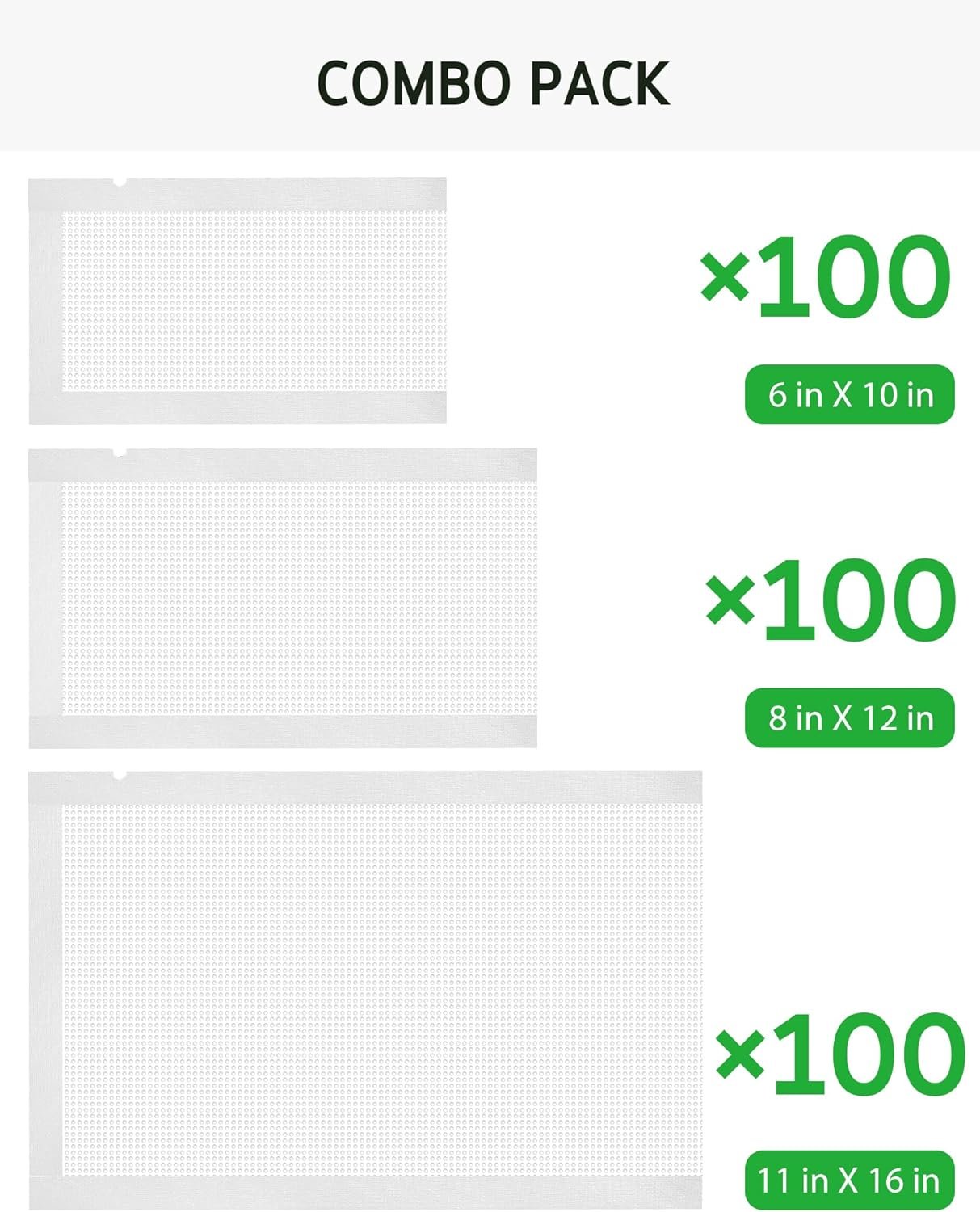 PreCut Design: Total 300 count 11″ x 16″ gallon size and 8″ x 12″ quart size and 6″ x 10″ pint size pre-cut bags. Just pull out and use; no need to cut, no need to seal one side before putting food in.