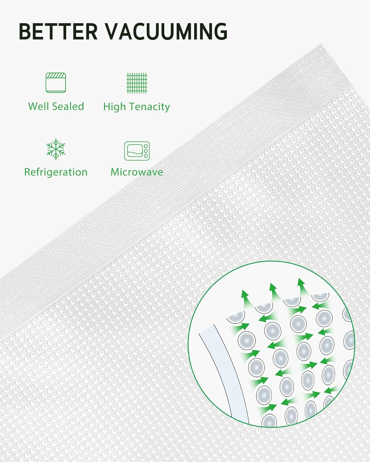 One side embossed channel and transparent on the other, provide strong suction and sealing, keep food from puncturing the vacuum bag.