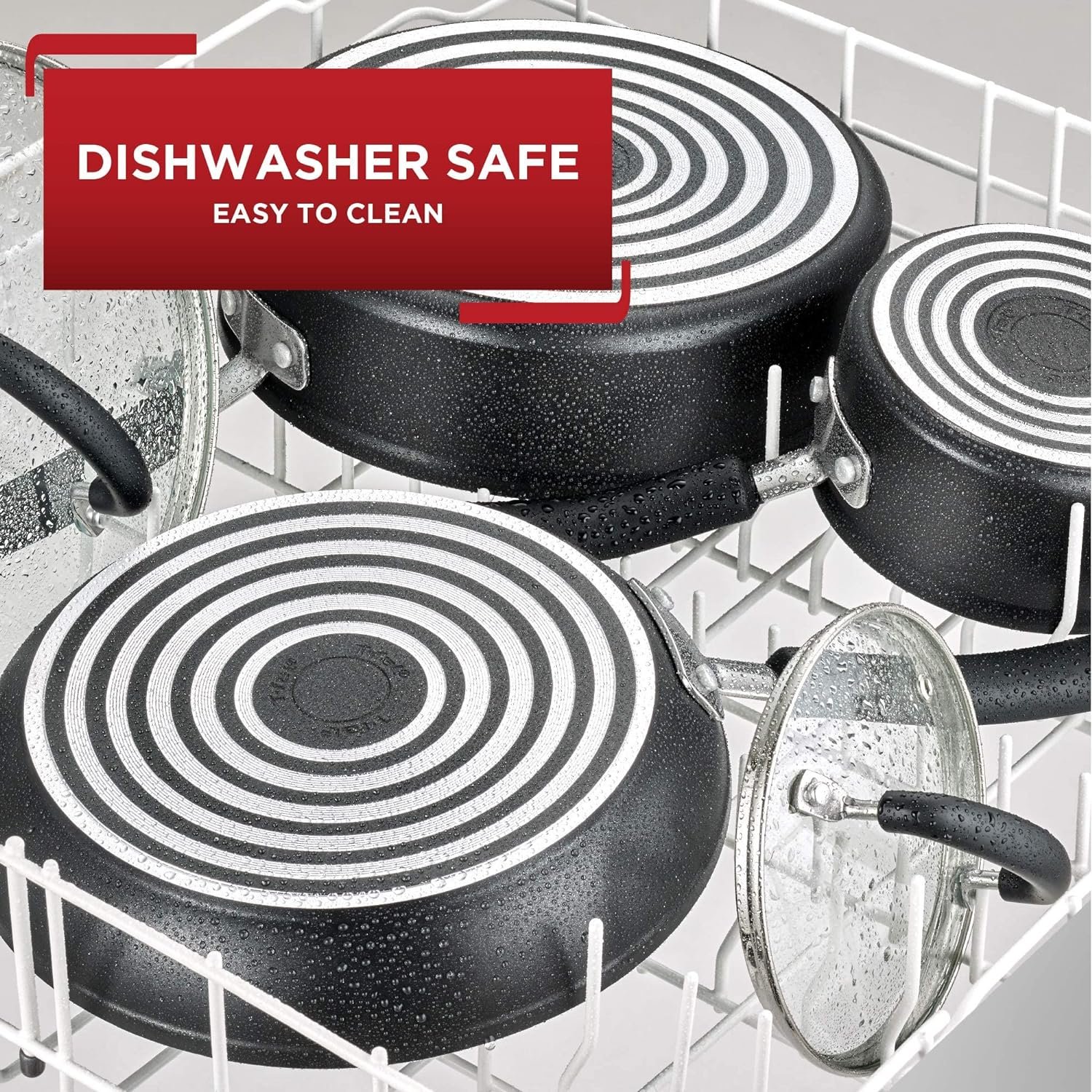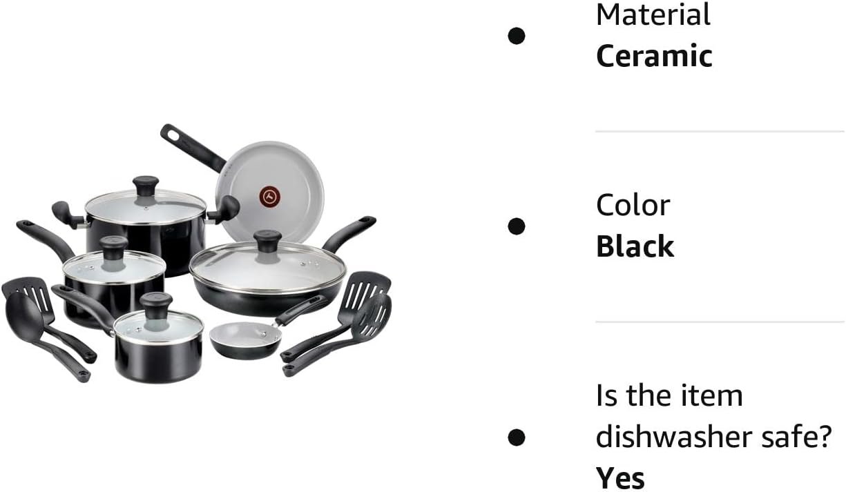 T-fal C921SE64 Initiatives Ceramic Nonstick PTFE-PFOA-Cadmium Free Dishwasher Safe 14-Piece Set Cookware, Black. The set includes: 8-Inch Fry Pan, 11-Inch Fry pan with lid, 1-Quart Sauce Pan with lid, 2-Quart Sauce Pan with lid, 5-Quart Stewpot with lid, One Egg Wonder, 4 nylon tools. 7″ frying pan is nestled under the small sauce pan.