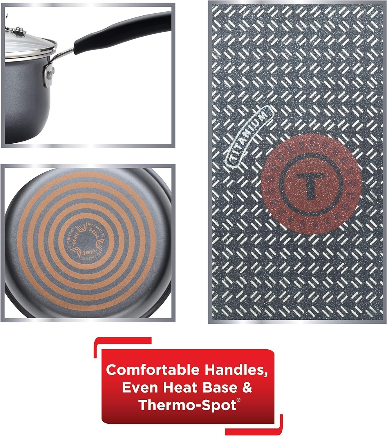 Heat mastery system: T-fal heat mastery system is a three ingredient recipe for perfectly delicious cooking results every time…superior and longer-lasting non-stick coating, an anti-warping, even heat base and Patented Thermo-Spot technology.
