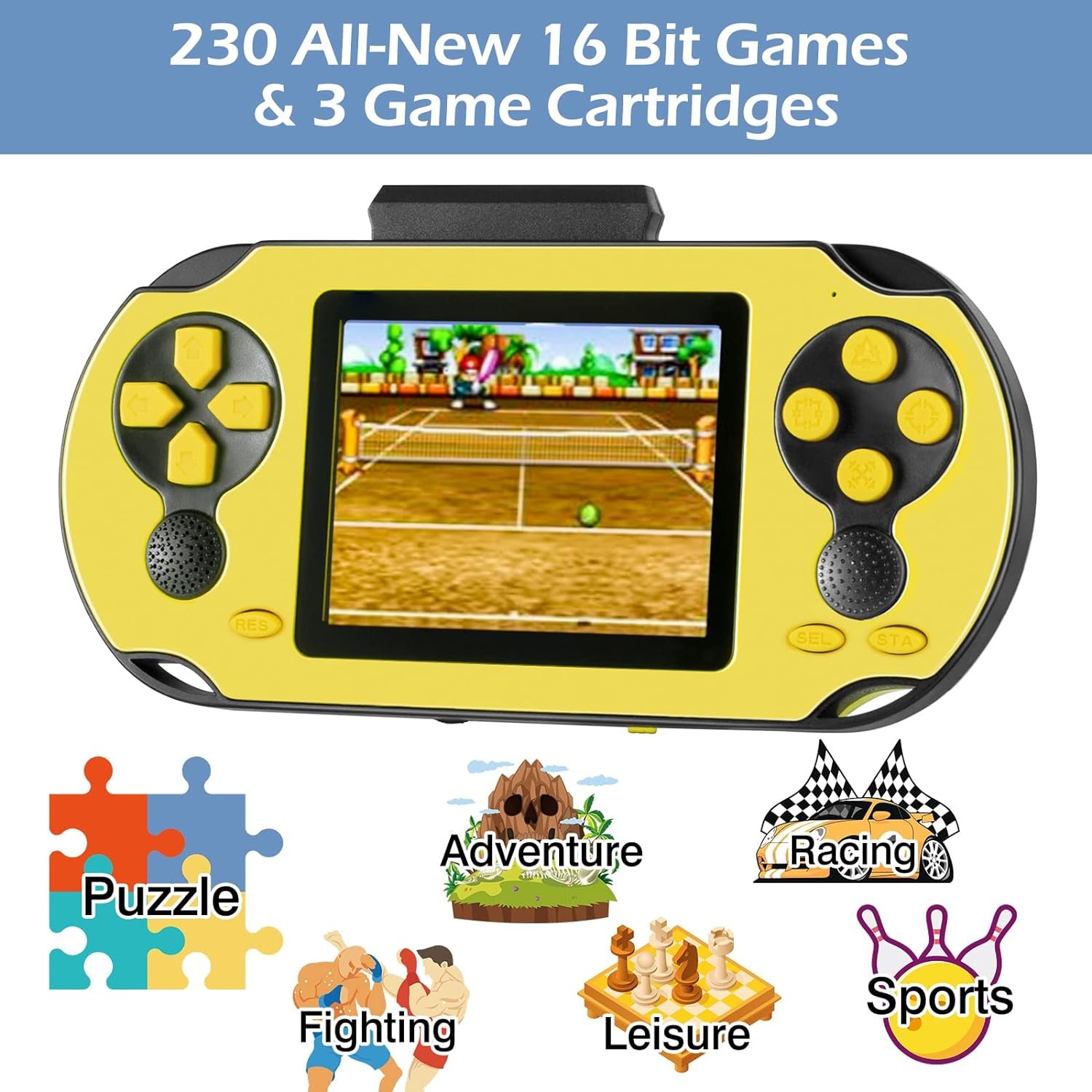 This newly designed handheld game console offers a variety of new and fun video games for children and adults. We paired it with a rechargeable and 3.0-inch color display, 230 built-in 16 Bit retro games and 3 individual game cards. This game console can help pass the boring time and is the perfect gift for kids or friends for Christmas or birthdays.