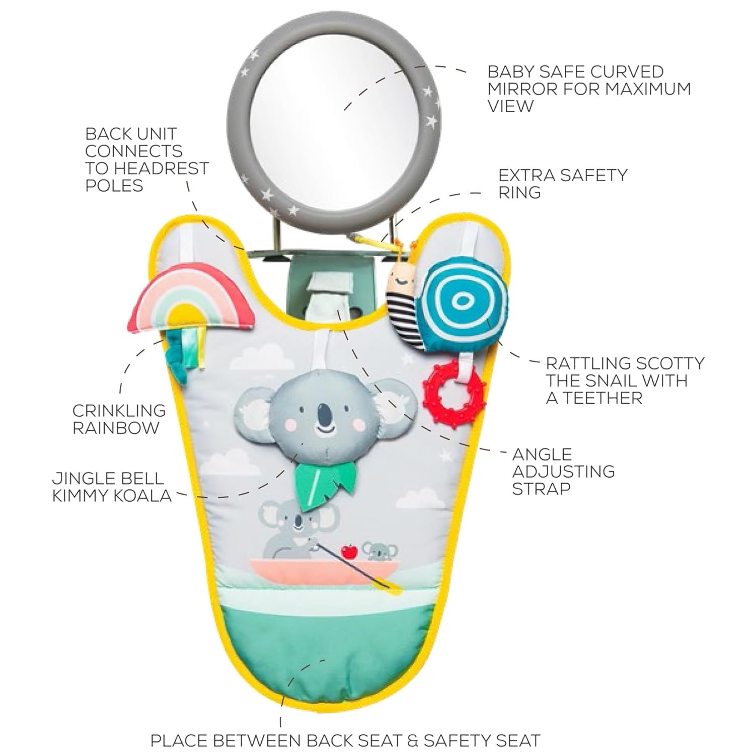 Rattling soft activity toys – crinkling rainbow, rattling Kimmy the koala and chime bell Scotty the snail with a baby teether. IMPORTANT – The toy is suitable only for cars with adjustable headrest with metal poles. There are two attachable triangle plastic rings to attach to the headrest metal poles.