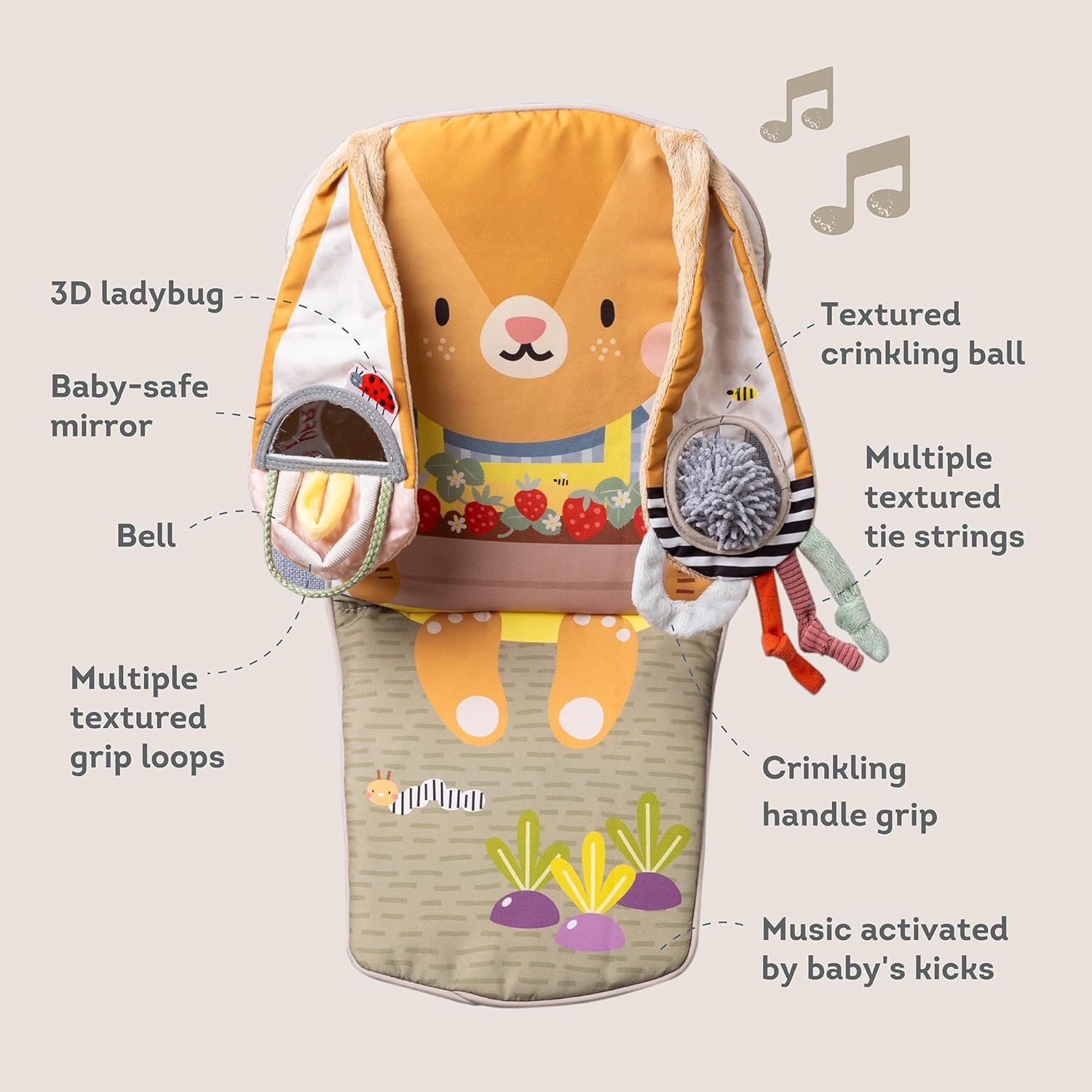 Rattling soft activity toys – Equipped with a baby-safe mirror, grip loops, and a crinkling bell to encourage the development of your baby’s senses and fine motor skills; The Bunny Play & Kick car toy is designed to contribute to a baby’s developmental progress; By engaging with its well-crafted features, infants can undergo sensory development, refine their fine and gross motor skills, grasp cause-and-effect relationships, and enhance their eye-hand coordination