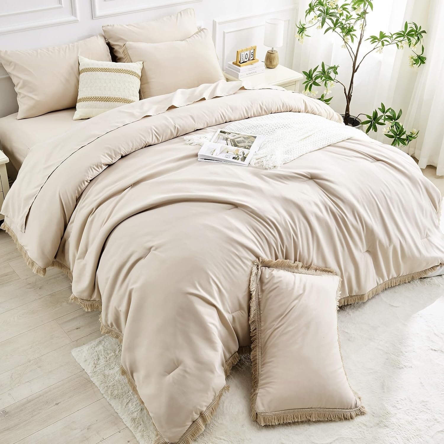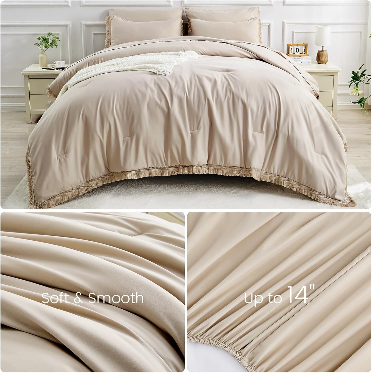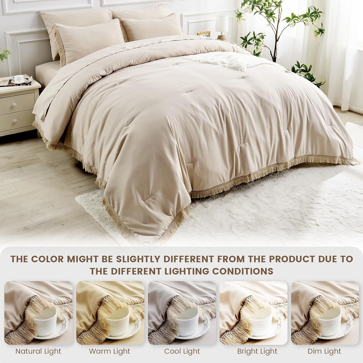 【Elegant Tassel Design】The DECMAY boho comforter set queen, with its tassels on the edge, brings a touch of elegance and grace to your neutral bedding.The hidden stitching design of the comforter securely holds the filling in place, ensuring that you can enjoy comfort throughout the night. With its simple and elegant style, this 7-piece taupe queen comforter set is suitable for most people, including girls, boys, women, men, adults, and teenagers.