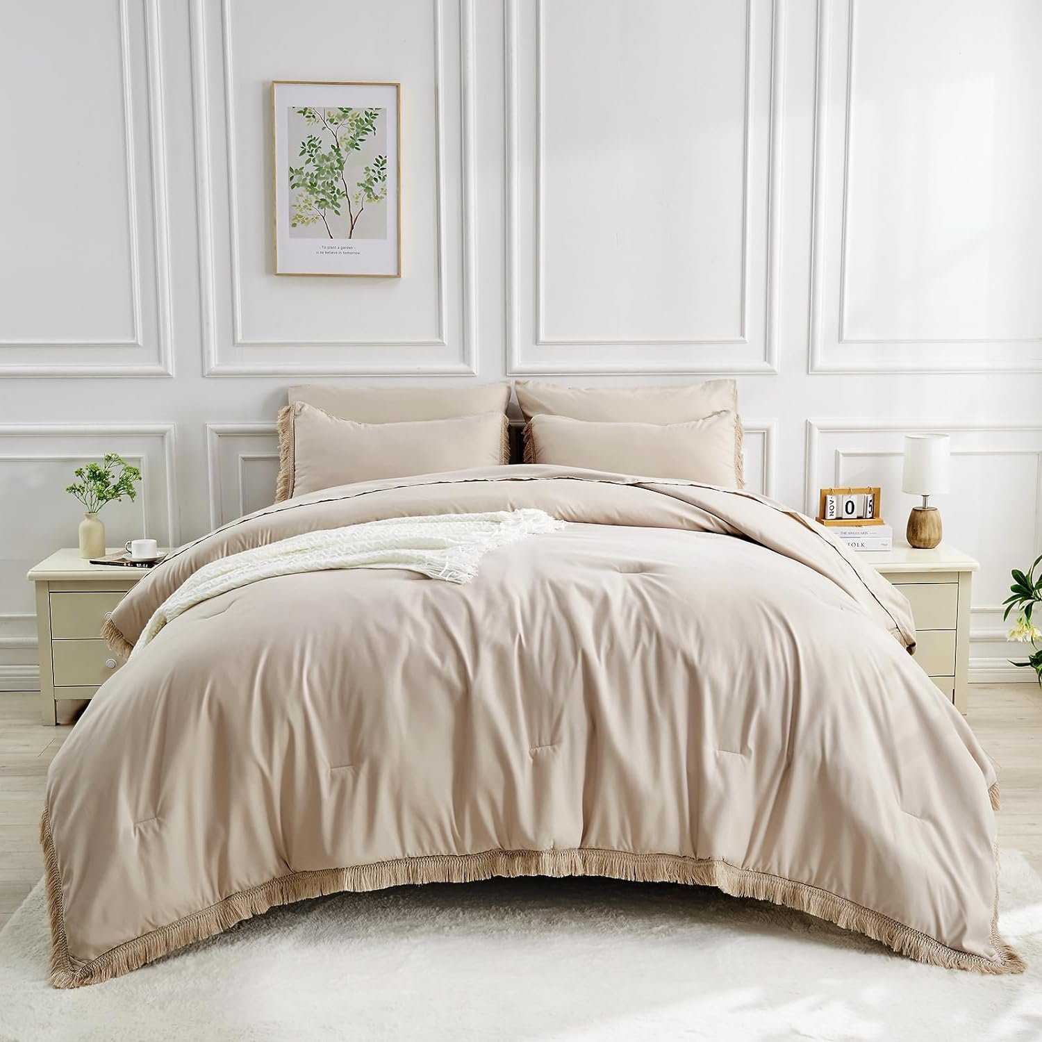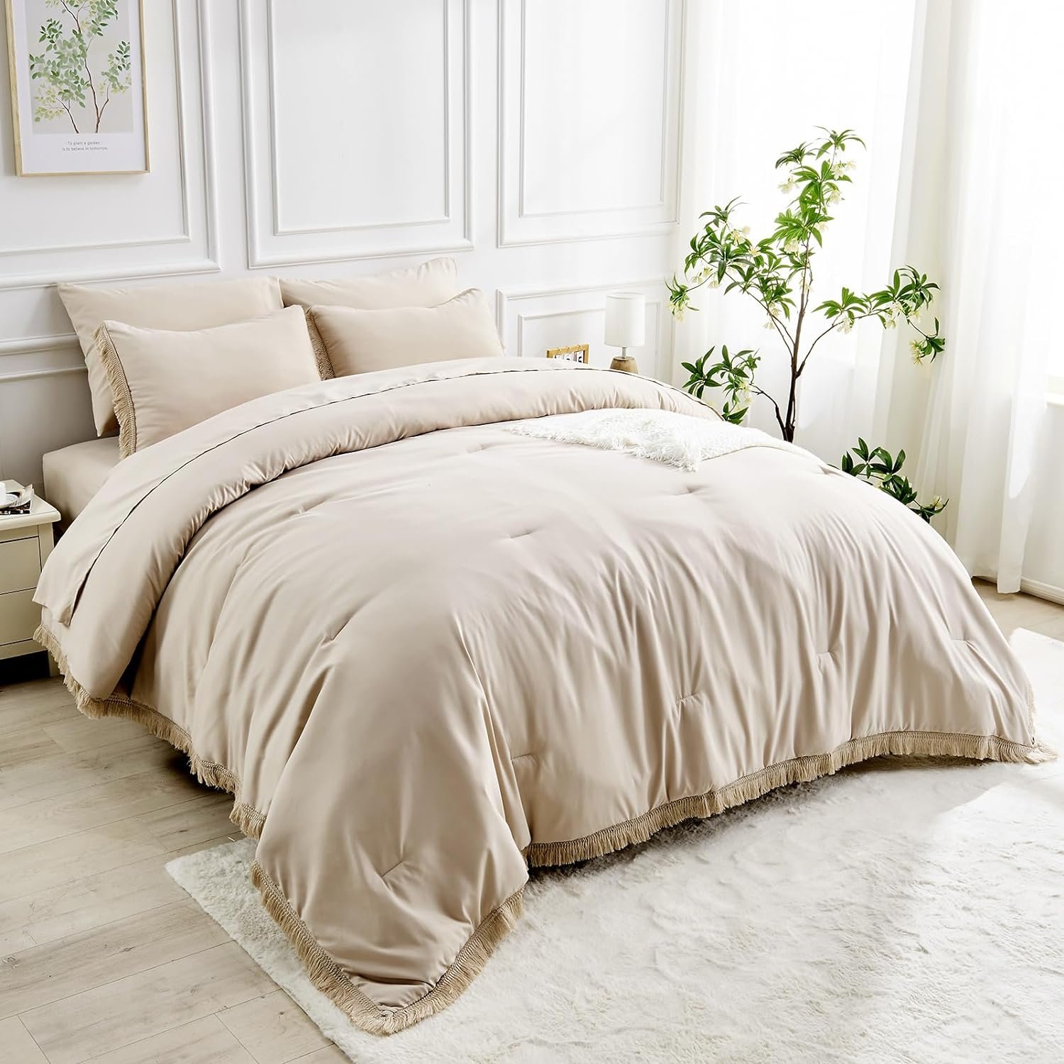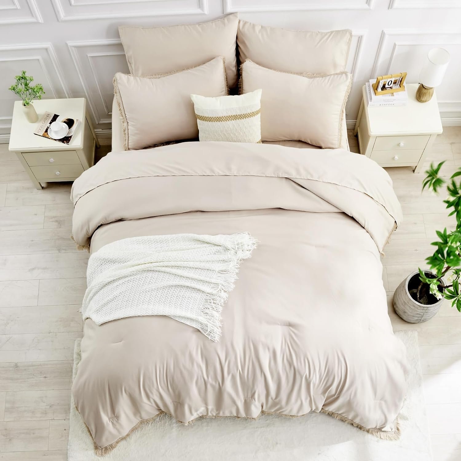【Elegant Tassel Design】The DECMAY boho comforter set queen, with its tassels on the edge, brings a touch of elegance and grace to your neutral bedding.The hidden stitching design of the comforter securely holds the filling in place, ensuring that you can enjoy comfort throughout the night. With its simple and elegant style, this 7-piece taupe queen comforter set is suitable for most people, including girls, boys, women, men, adults, and teenagers.
